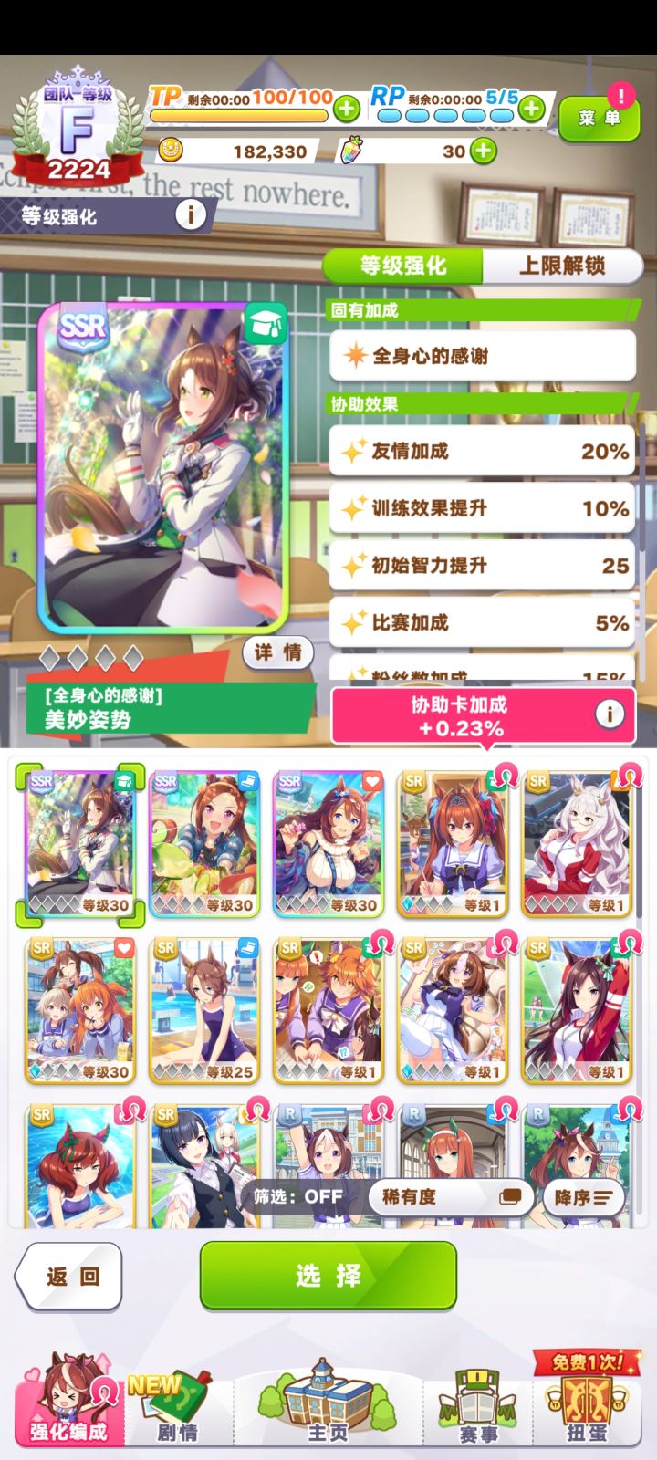 昨天七点下的游戏,打到现在终于养成通关一次了,和我一样刚玩的兄弟给你们一个攻略。前期给的宝石全抽辅助卡不需要满破,凑齐两张速度两张智慧一张耐力,白送的材料把卡升满,漂一张好兄弟的速度卡,随便两张有评级的马娘当教练给点属性就行,用开局送的sr马娘领头跑法,训练顺序速度比耐力多150直到耐力到400就行,智慧也点到400不过可以缓一下,然后全点速度技能点各种加速和回体力,就这么多先睡了。