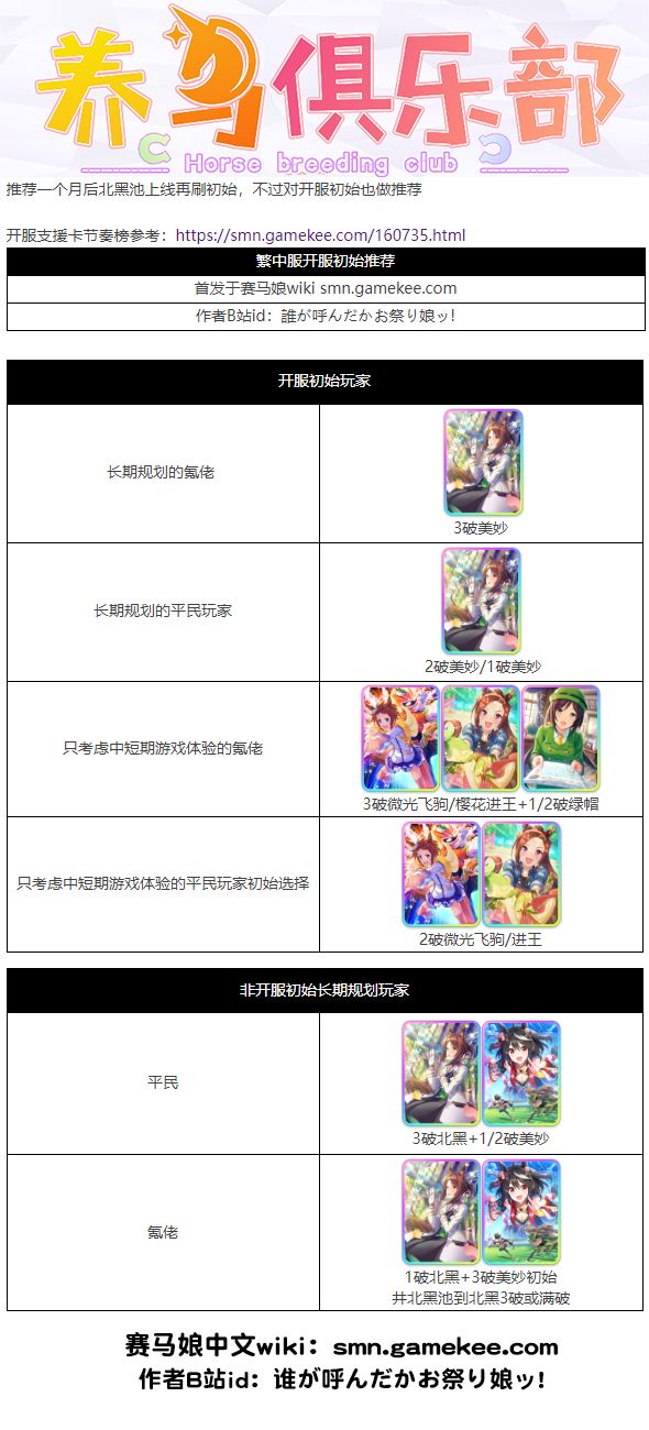 一.开服初始玩家:长期规划的氪佬 初始选择: 3破美妙长期规划的平民玩家 初始选择: 2破美妙/1破美妙只考虑中短期游戏体验的氪佬 初始选择: 3破微光飞驹/樱花进王+1/2破绿帽只考虑中短期游戏体验的平民玩家初始选择 2破微光飞驹/进王二.非开服初始长期规划玩家平民 3破北黑+1/2破美妙氪佬 1破北黑+3破美妙初始 井北黑池到北黑3破或满破赛马娘攻略站:https://smn.