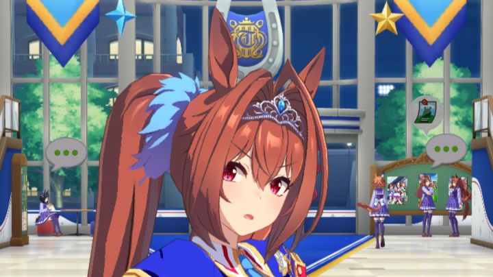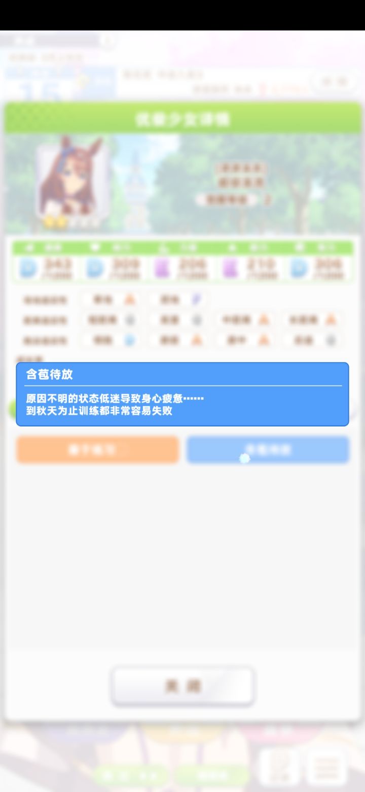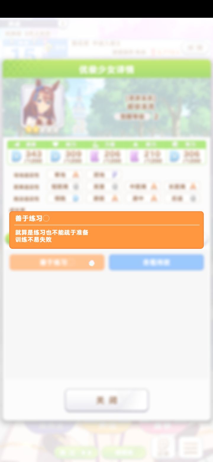 赛道:①赛程分为序盘——中盘——终盘,序盘占据赛程的1/6,中盘占据赛程的1/2,终盘占据赛程的1/3(注:位置意识生效在序盘和中盘)②赛道由直线与弯道构成,两端必定为直线,某些赛道有上下坡,上坡会降低速度和基础加速度(受力量影响),下坡提升速度和减少体力消耗(受智力影响)③最终弯道:马娘会在最终弯道散开寻找冲刺的跑道④最终直线会触发追比,触发追比后会提升速度与加速度(受毅力影响)被动技