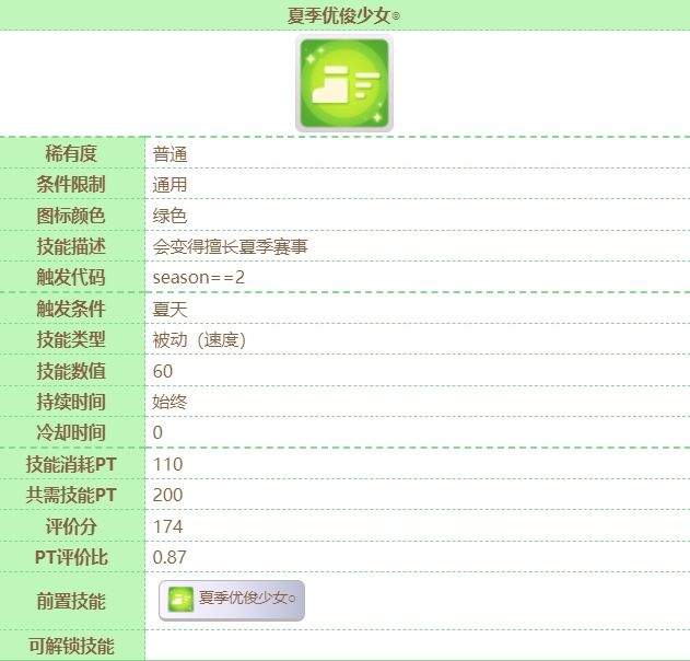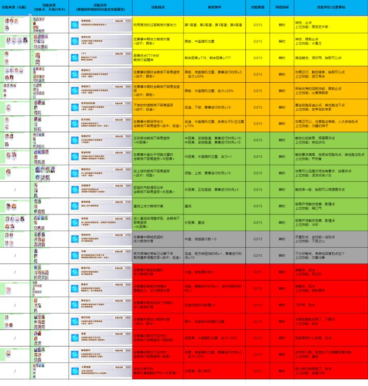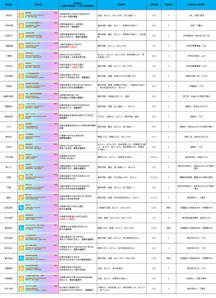 RT。技能评价是以大赛的角度评估的,个人理解,如有不同意见勿喷。妨害技能只推荐<吞噬速度><吞噬体力>,其他不做评价;被动技能均为单圈增加属性40,双圈属性增加60。下面以单圈为例顺逆时针、四季:+40速度赛场擅长:+40耐力场地状态擅长:+40力量天气擅长:+40毅力跑法擅长:+40智力,5视野范围另外,国服萌新交流群收人啦,萌新或者大佬都欢迎,群里氛围很好,每周群内还会举办