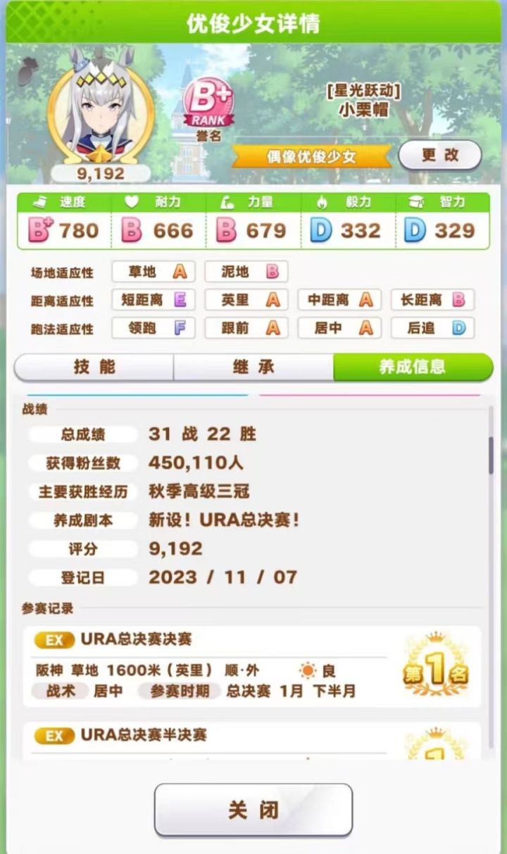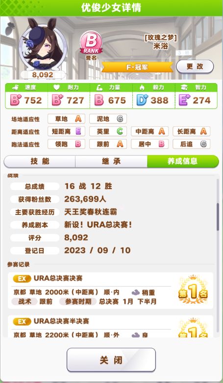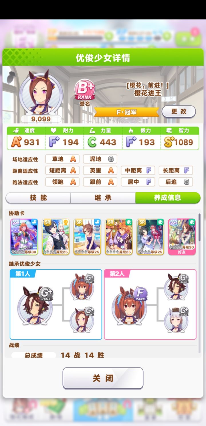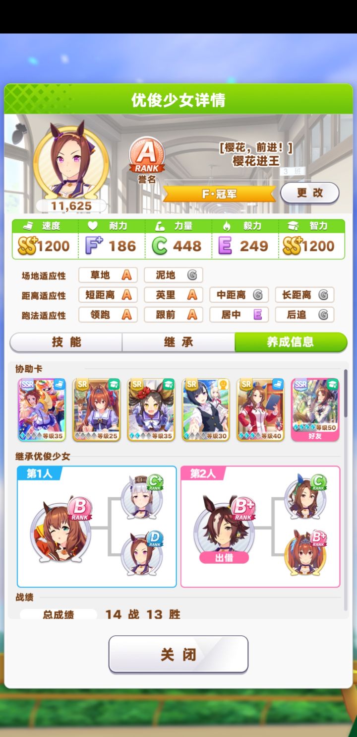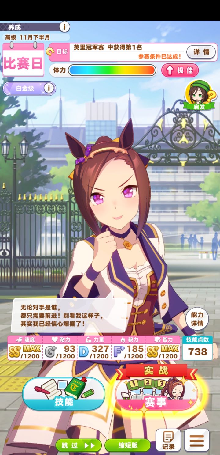 玩法:1.父母优先速和智,支援卡3智2速1友。推荐领跑。2.开局先约个会提升心情,训练主智副速(沙滩特训时全部满级训练,所以拉一下速度,主速副智)。平时保持体力在四分之三即可,用智力训练恢复体力,经量不用休息。3.技能有啥学啥。低配即可全胜,图一我用新创的号试验,大概30分钟,ura之前大概900速1000智,过关最终评分B+。后面图是我换了玩了两天的号,ura比赛前可以速智双属性120