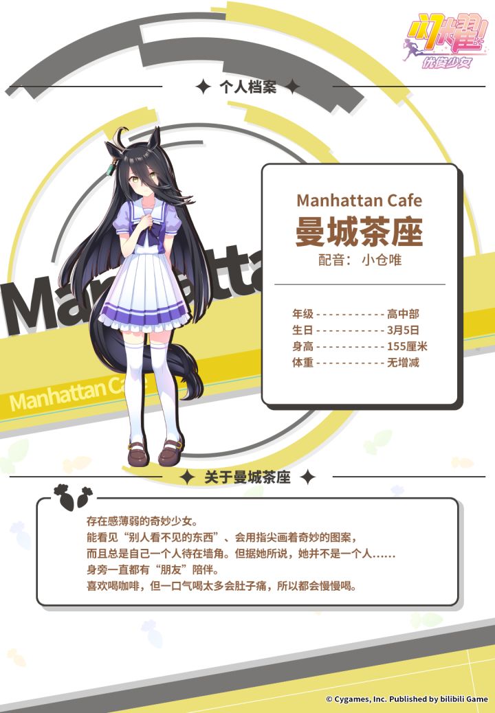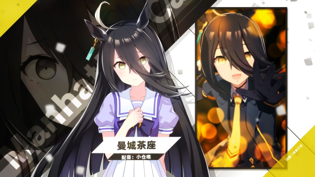 全国的新人训练员们,来认识一下那些在特雷森学园和我们一起实现梦想的学生吧! 存在感薄弱的奇妙少女“曼城茶座”。能看见“别人看不见的东西”、会用指尖画着奇妙的图案,而且总是自己一个人待在墙角。喜欢喝咖啡。 配音:小仓唯