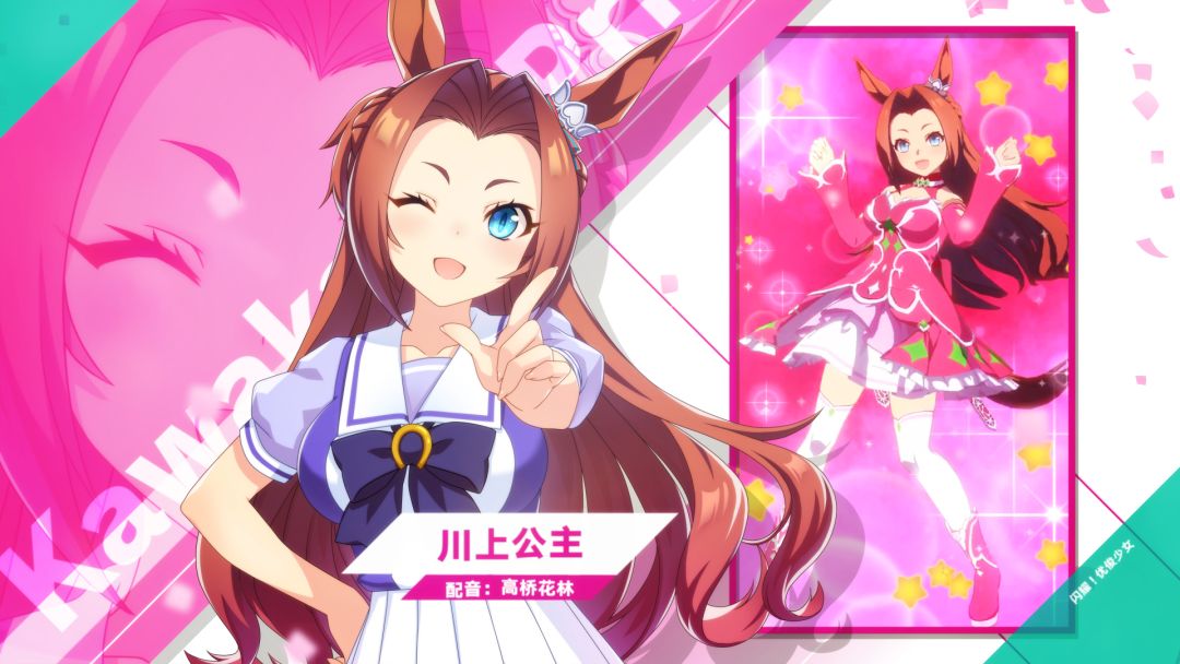 全国的新人训练员们,来认识一下那些在特雷森学园和我们一起实现梦想的学生吧! 以成为公主为目标的活泼少女“川上公主”。在公主之路上迈进的同时,梦想着遇见属于自己的王子的那一天。 配音:高桥花林
