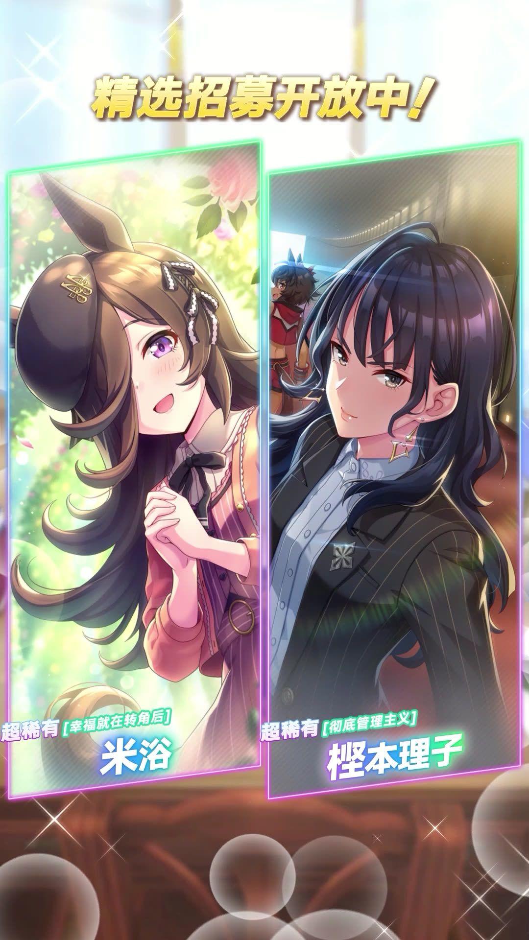新的超稀有 [幸福就在转角后]米浴、[彻底管理主义]㭴本理子等协助卡登场! ■新登场的协助卡 超稀有 [幸福就在转角后]米浴(配音:石见舞菜香) 超稀有 [彻底管理主义]㭴本理子(配音:朴璐美) 普通 [特雷森学园]㭴本理子(配音:朴璐美) 5月22日 维护后,游戏内已开放“精选 协助卡招募”,还请不要错过! 今后也请多多支持《闪耀!优俊少女》!