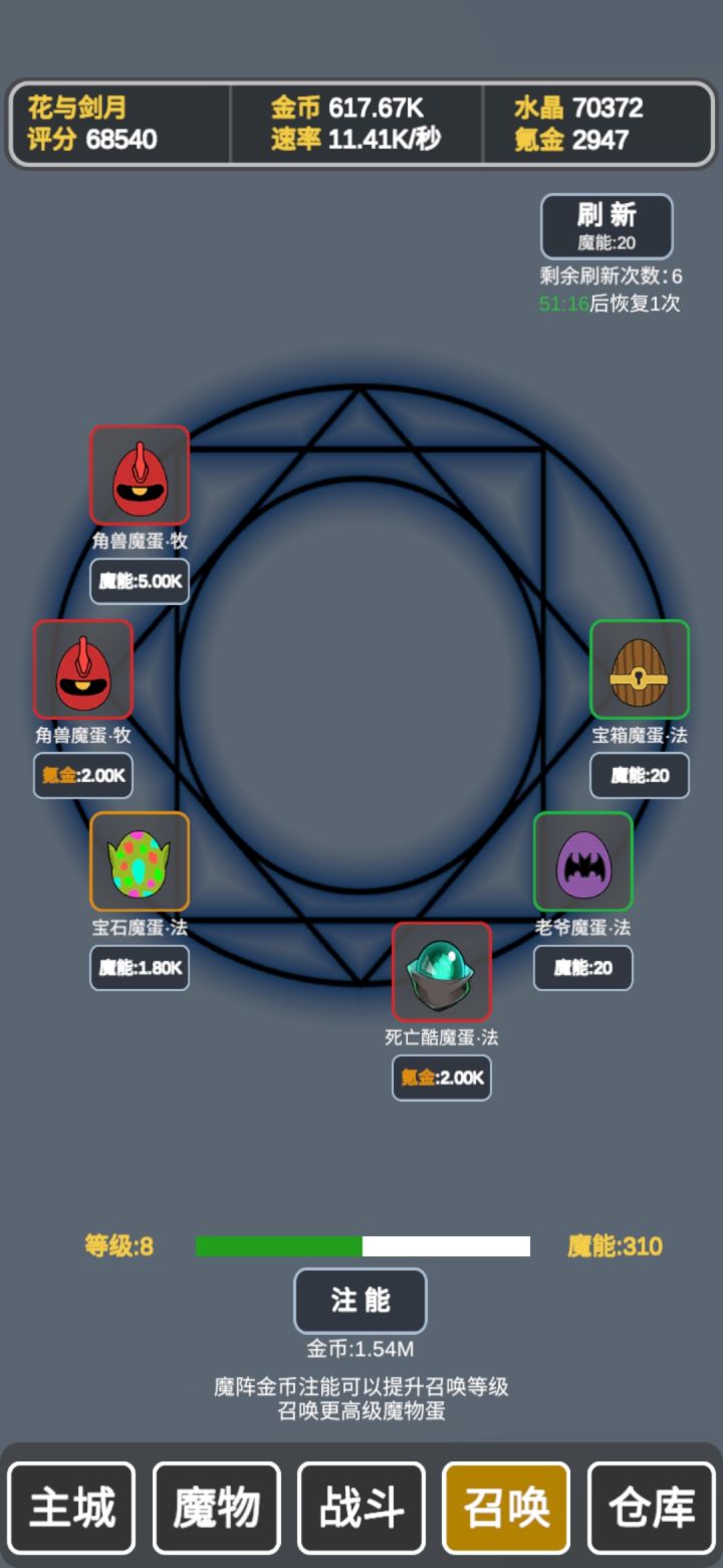 前期的主要目的是快速提升魔王核心阶数,开启其他主线以及锻造。1. 快速升到五阶魔王核心,开启第二战队和武器锻造送的资源可以直接升到三阶,建造孵蛋室,接下来去召唤买魔蛋,加上送的史莱姆蛋(史莱姆真可爱),快速集成五人第一战队,去战斗挂机刷魔核,只有东部的地图击败勇者会掉魔核,魔核就是用来升阶魔王核心的主要材料了,挂机战斗的产生要手动去领才会得到。注意要提升战队等级,提高产生效率,等级上去了,魔核