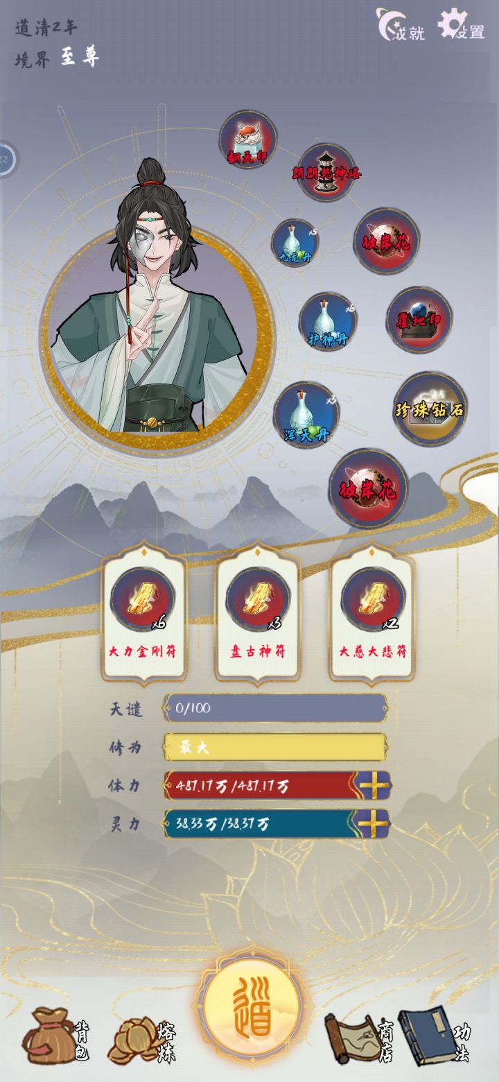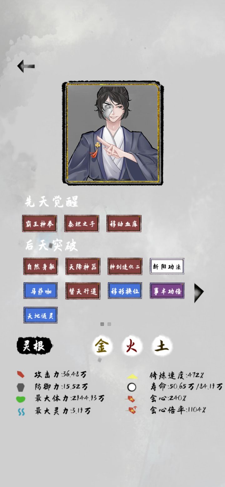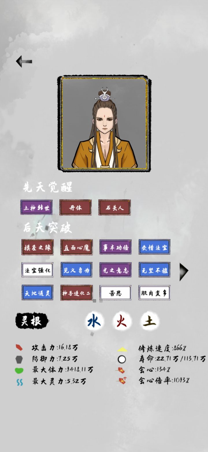 这个流派的核心思路就是暴力,开局刷单灵根,什么灵根都无所谓因为反正用不了法宝,核心天赋是自然身躯,天赋全都选加攻防和修炼倍率的,灵石多的没处花就刷商店买加属性的丹药(但必要性不大不买也行),然后就没别的了,玩到后面都不知道干啥有点无聊