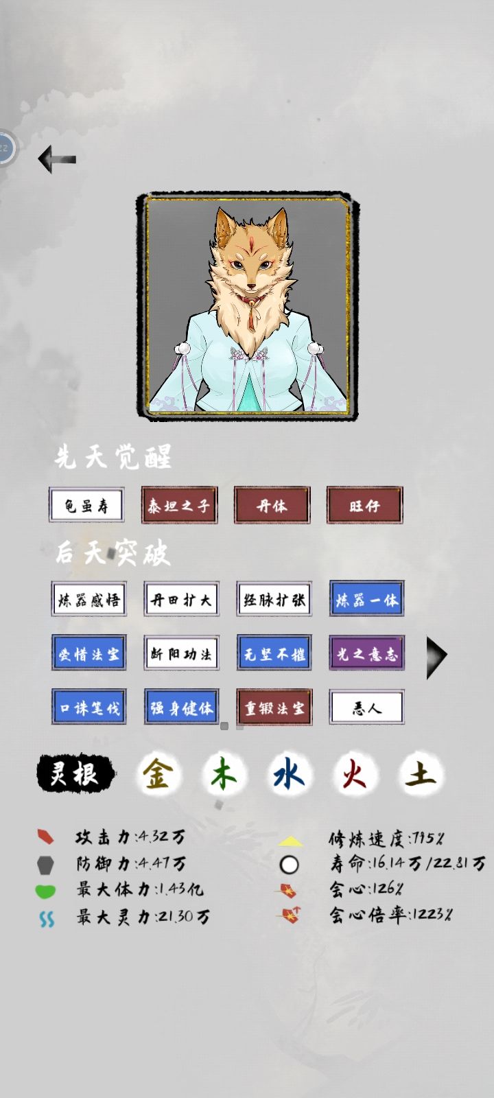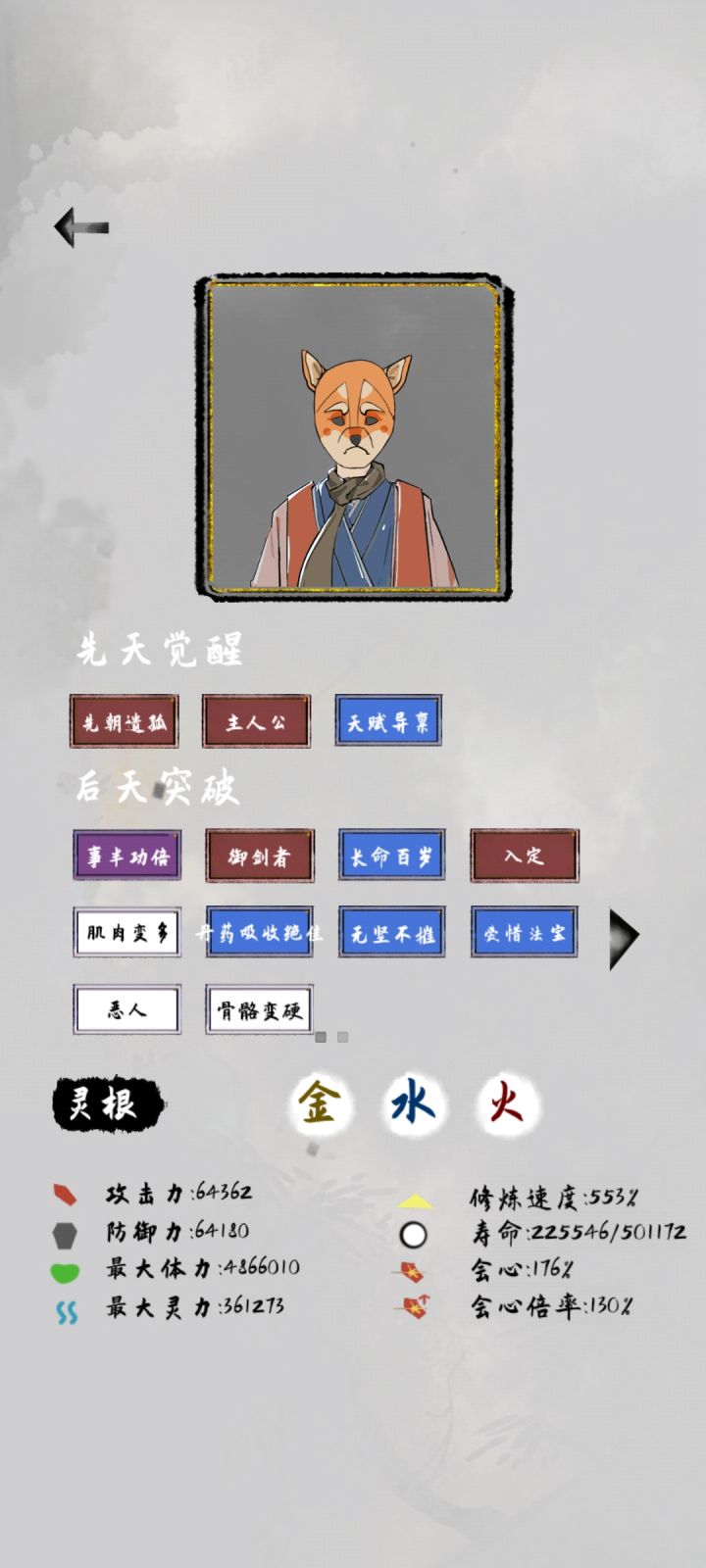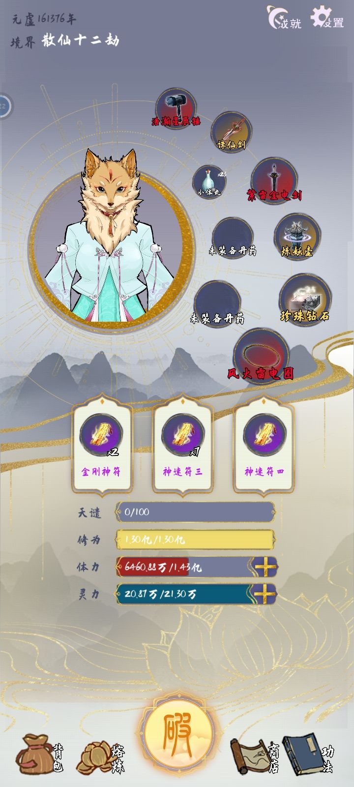 这个流派的核心思路就是暴力,开局刷单灵根,什么灵根都无所谓因为反正用不了法宝,核心天赋是自然身躯,天赋全都选加攻防和修炼倍率的,灵石多的没处花就刷商店买加属性的丹药(但必要性不大不买也行),然后就没别的了,玩到后面都不知道干啥有点无聊