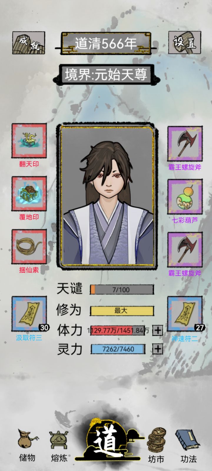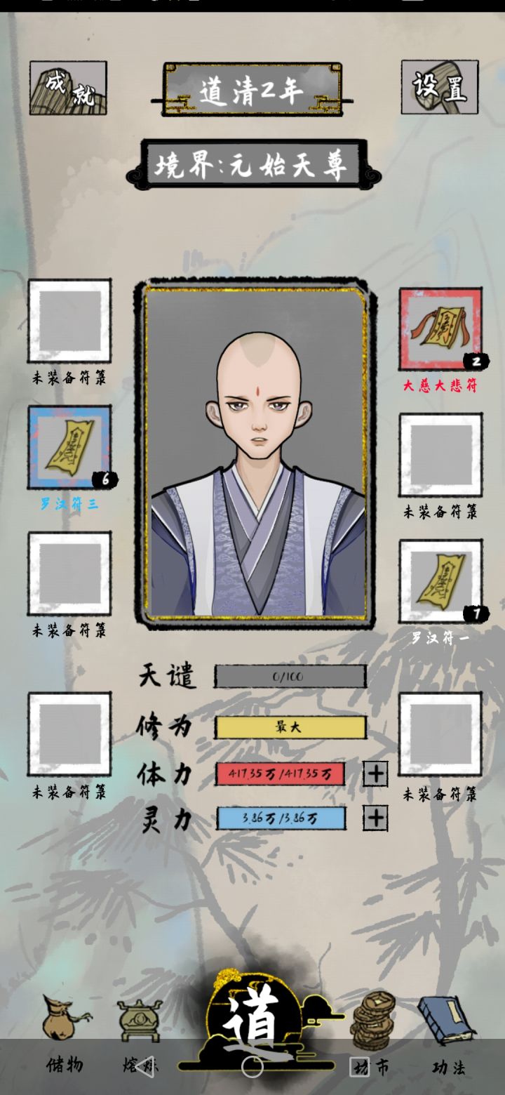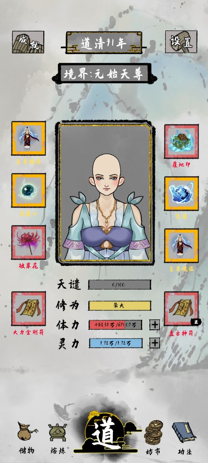 霸王神拳流派,攻击1500w,一拳加符和丹药最高35亿,建议送死九转丹刷属性,体力药和会心药还有攻击寿命药要到大罗或者元始再吃,打boss用罗汉符加速击符就能过。人物建议光头,天赋霸王神拳加护甲没有护甲可以不用,后天最好能刷到符箓道神和直面心魔。灵根可以单灵根以防脸黑老死,霸王神拳不需要法宝所以灵根无所谓。