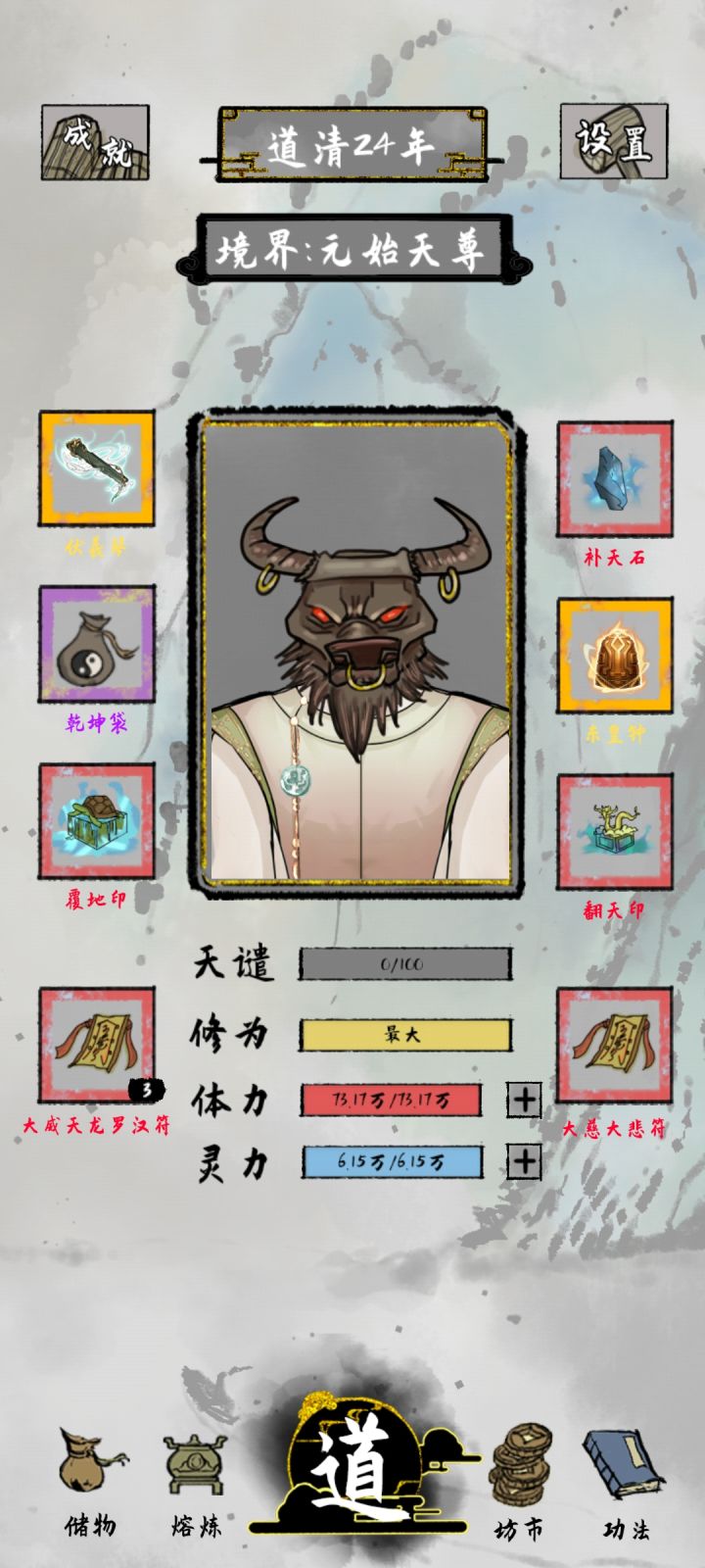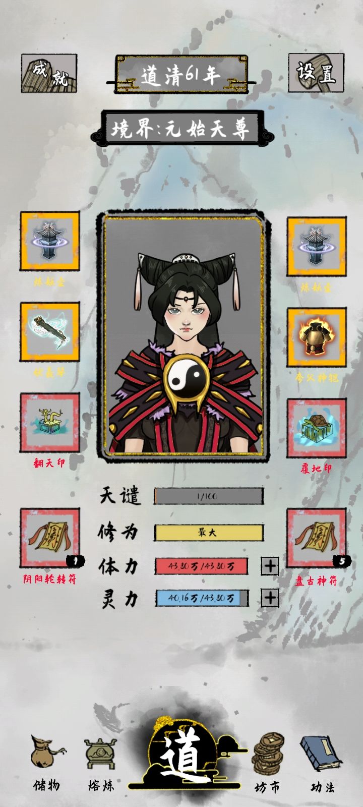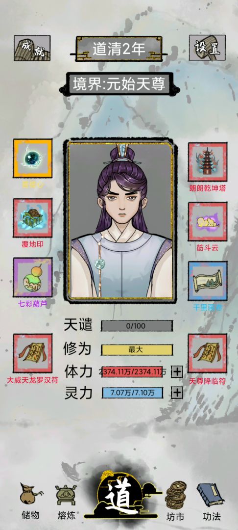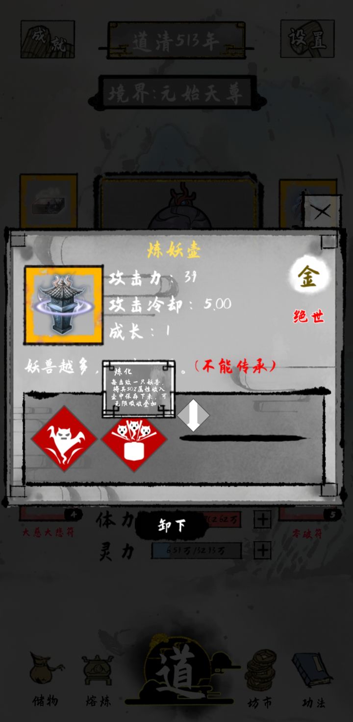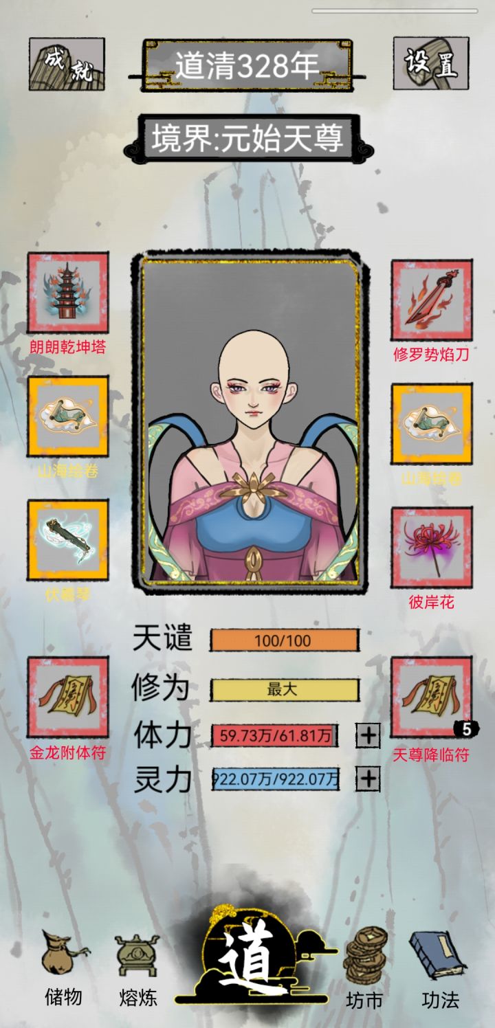目前问道五百多层 估计700多层就到大限了炼妖壶真的好用 可以一直累伤害(目前大概有1亿伤害 基本全秒)前期一定要多磕药 寿元和攻击的丹药有就吃 因为属性升级按百分比来 所以越早磕药越好上古灵宝目前能合成的只有傀儡和板砖 其余的合成不了 想获得基本只有通关全部秘境(金装不一定比红装好用 选法宝的时候多看看属性介绍)开局天赋建议选可以加攻击或者体力 前期想办法多提升寿元(ps:啥时候能更新点儿感情线 打了几十亿年光棍真的受够了🙅)