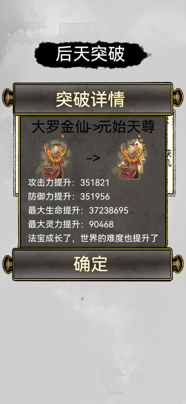 开局刷了个丹体,个人爱好五行灵根,啥法器和功法都能用。渡劫期大圆满突破是个关键点,这里打心魔赢了就走金仙天仙路线,输了就走散仙路线,散仙十二劫还是十三来着,每升一劫就打一次心魔,相对散仙来说,金仙那条路更简单,更快到大罗金仙,不过散仙更厉害一点,打一次心魔选一次后天天赋,天赋应该要比金仙路线多一点,走散仙路得备些保命和加攻的丹药或符箓,自己攻防加了心魔也跟着加,打心魔的同时每隔几秒还会落下劫雷扣