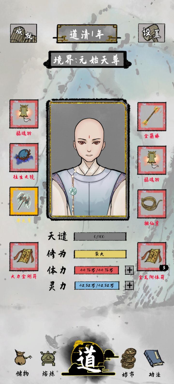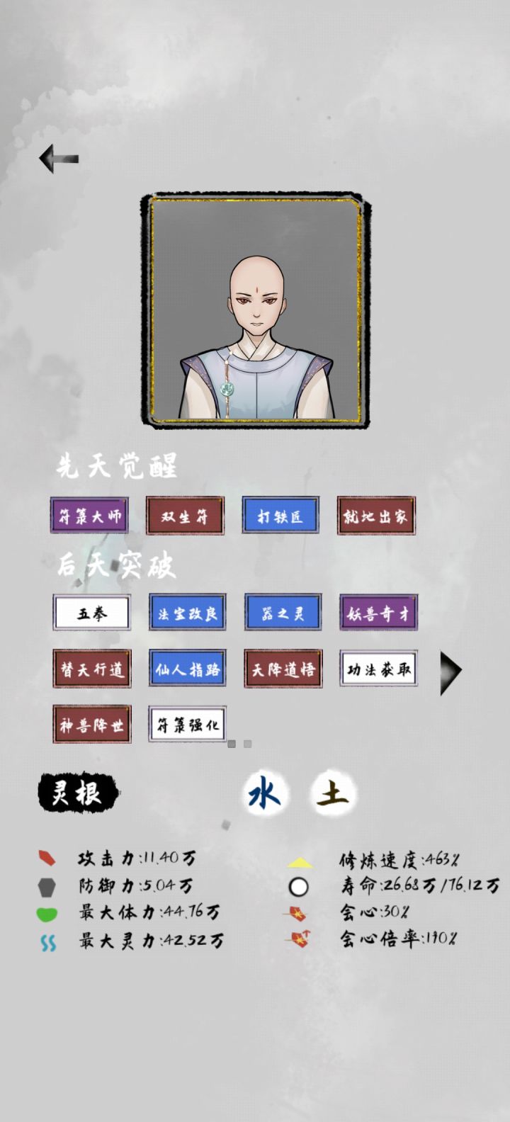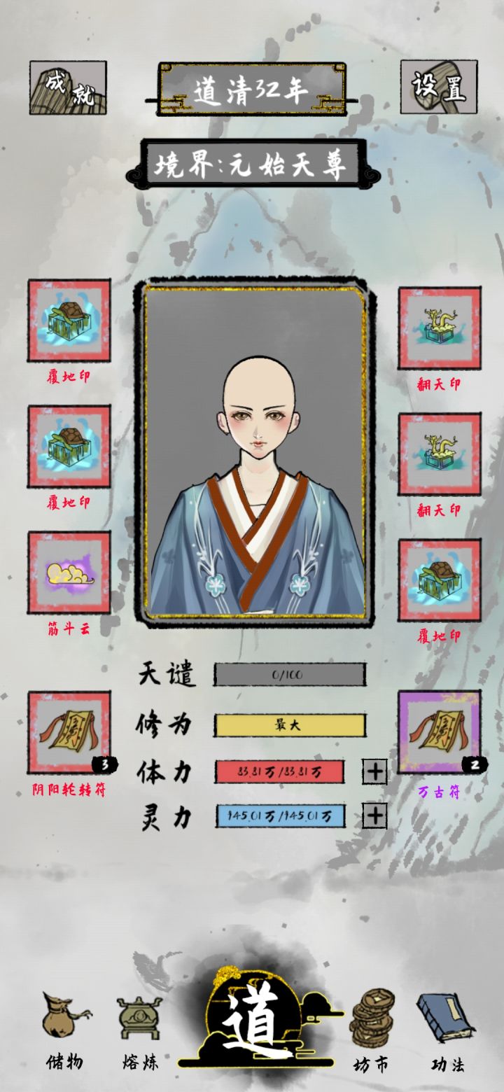 天赋:双生+大师、另外个随意 符咒:天尊(分身一个人物属性为1100%的boss)+吸血和无敌都可以 法宝:任意召唤物法宝(前期遇见boss才稳)+近站武器 什么东西都可以卖了或者留法宝合成好玩、寿命也不怕、就是无语突破到问道了也要扣寿命、