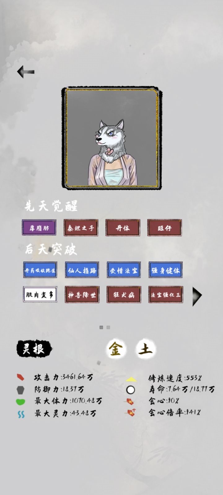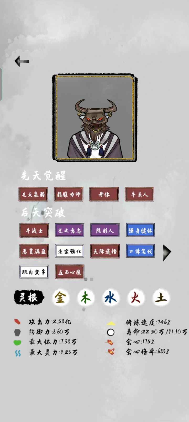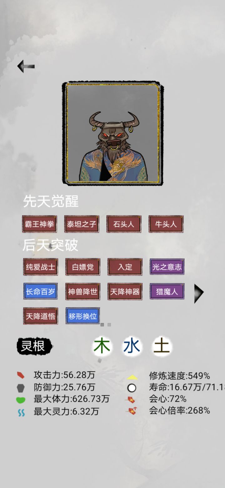 看看特有属性:当形象为牛头人时,体力-30%(DEBUFF),战斗时自动获得生命最大值30%护甲,学习功法消耗灵石翻倍(DEBUFF)”。最重要的就是这个30%护甲是独立按照最大生命值计算的,所以生命值无脑加就可以啦。