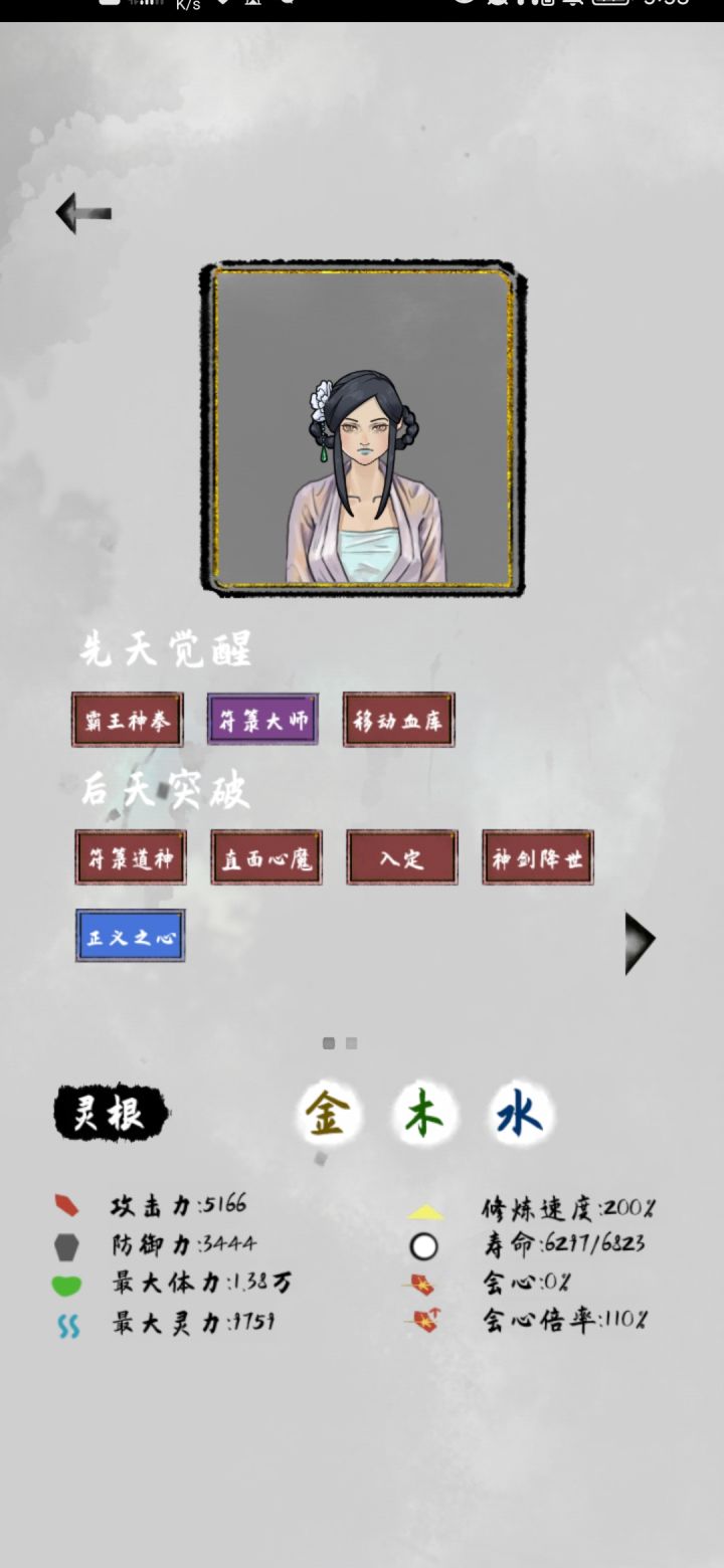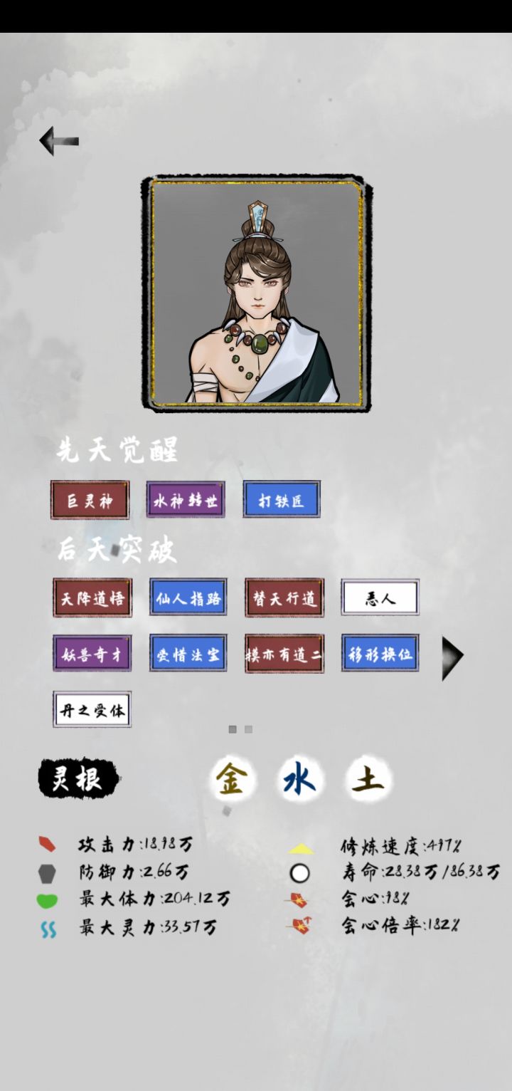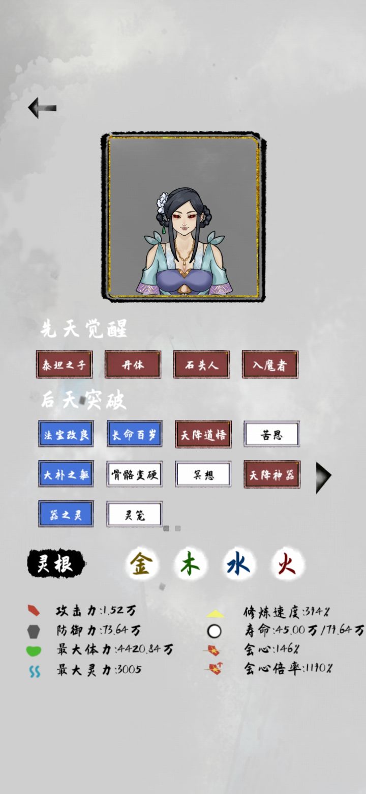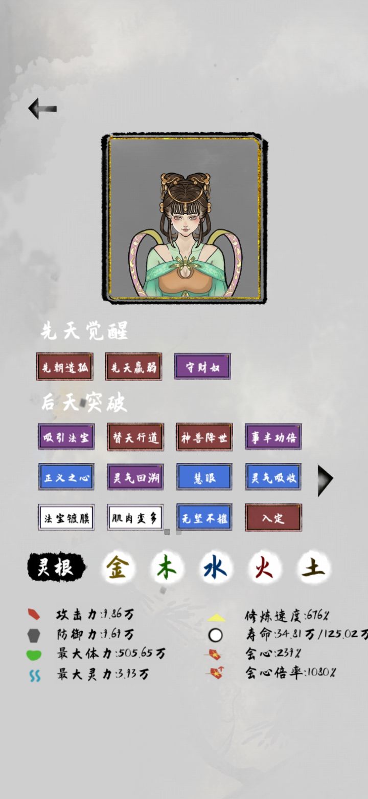 二、先天觉醒:先天觉醒五花八门,想要无脑撞就无限“淬炼肉身”就好了,所以《霸王神拳》必选!!,攻防+200%,但无法使用法宝和功法(无所谓了,反正也用不到)其次要注意的是要抵消体力-30%的DEBUFF,最后一个选:修炼速度、防御类的先天就好。