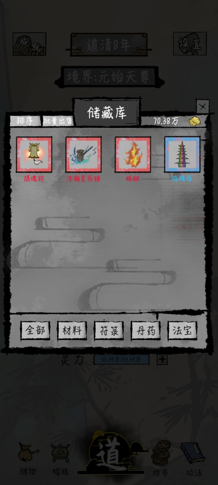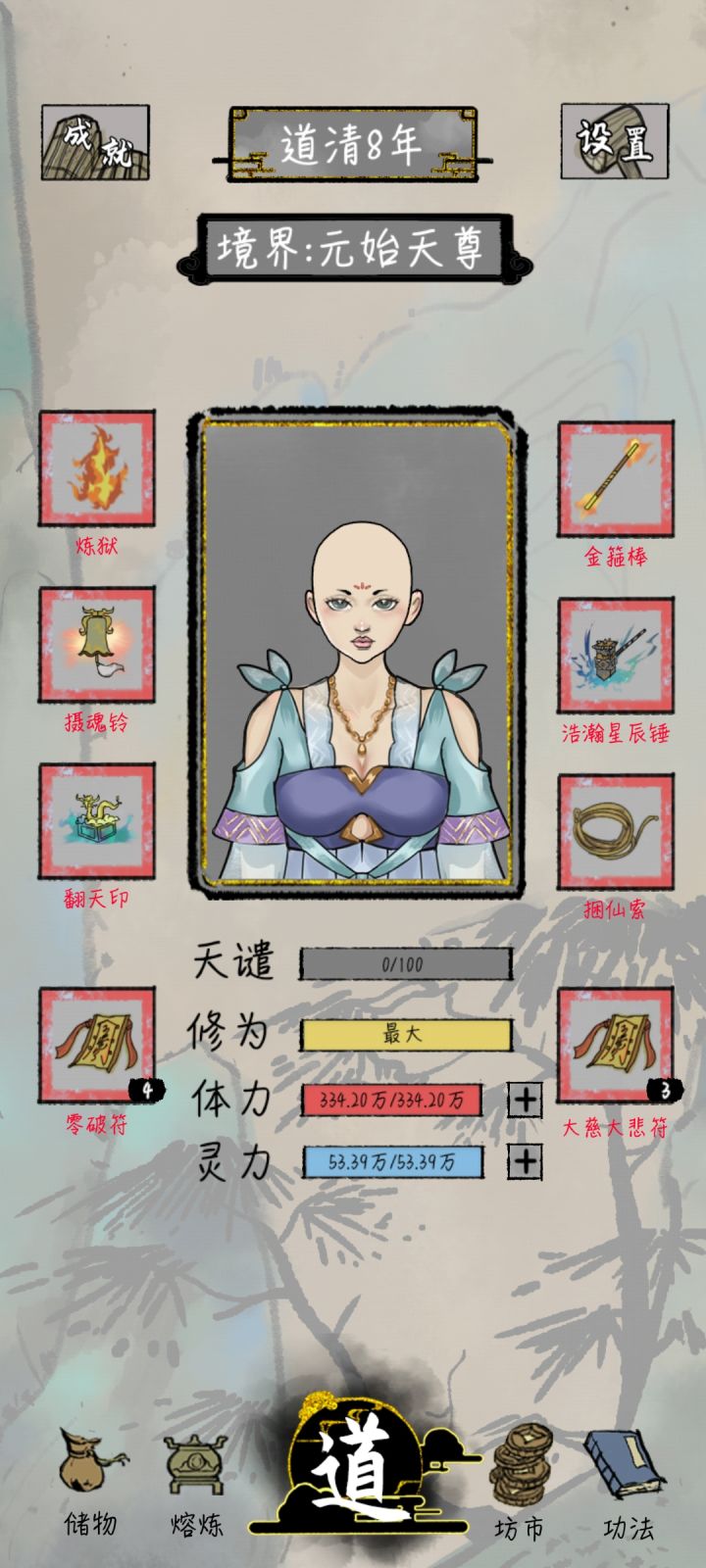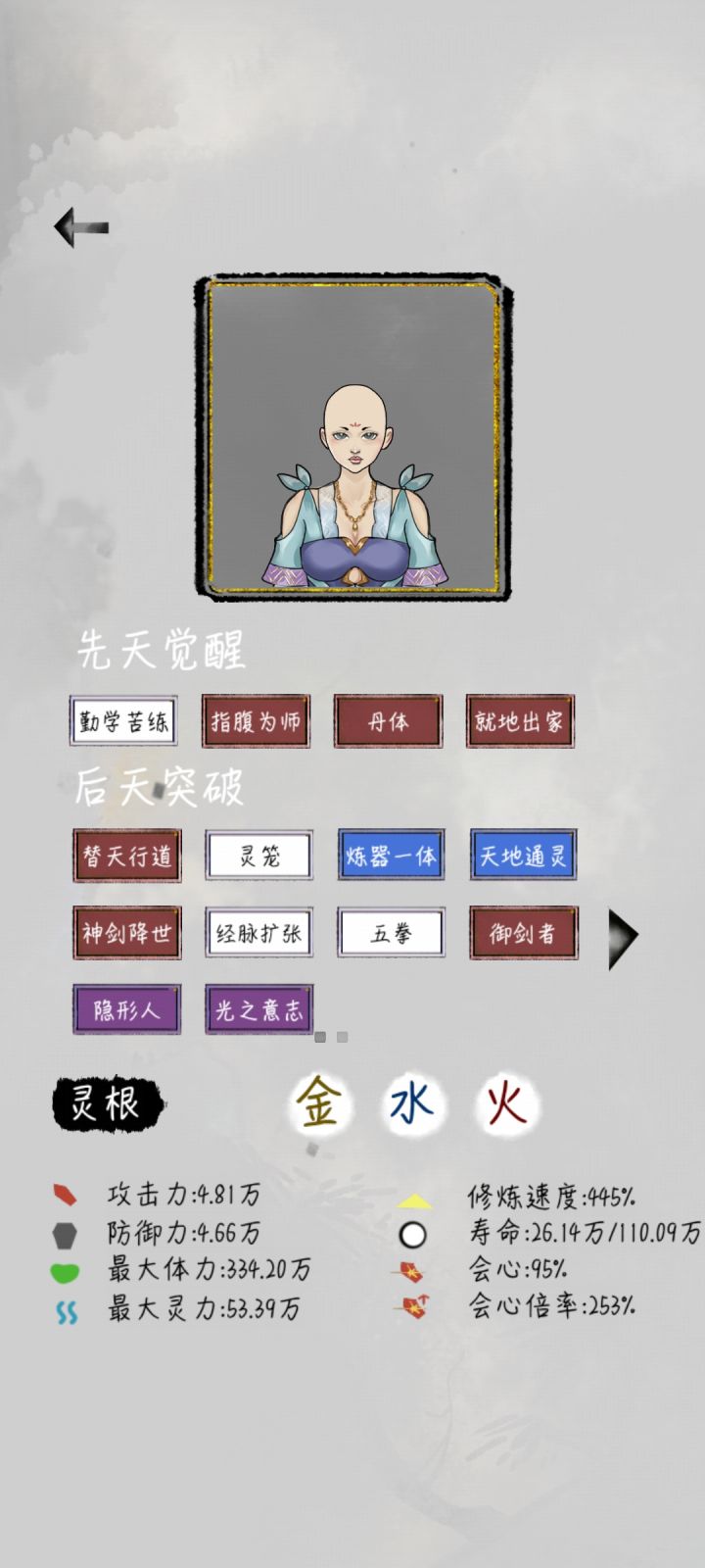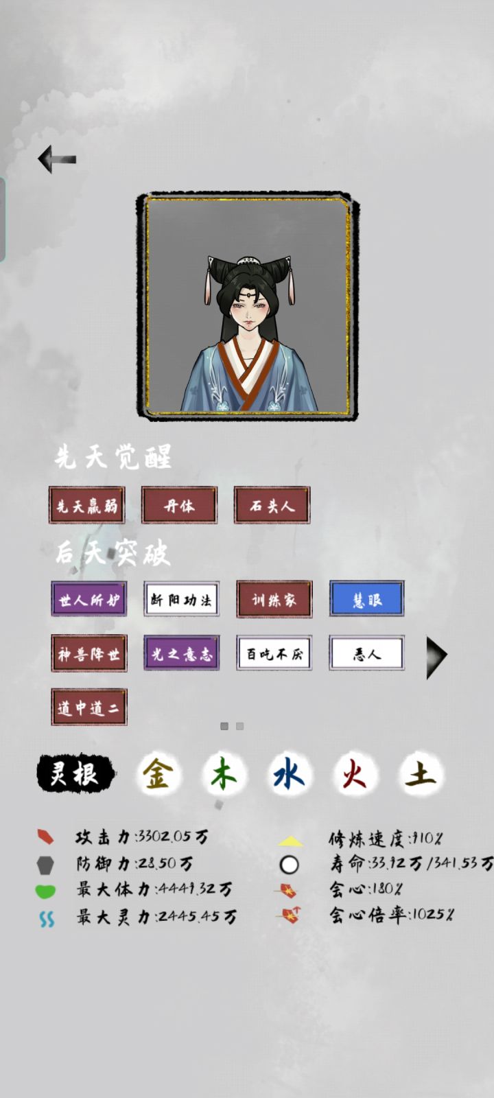这个不是我最好的档,最好的那个档,是个漂亮小姐姐,灵根五个全有,修练比较慢,但是那个号拿到了两个上古器灵,金色装备,很强。