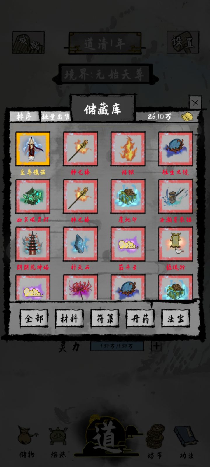 法宝的话,这个用的近战金箍棒和锤子,很无敌,贴脸就秒了,捆仙锁和镇魂铃次要的,突破有一个御剑者可以拿(减近战CD)。注意打大妖兽和心魔要注意躲弹幕。