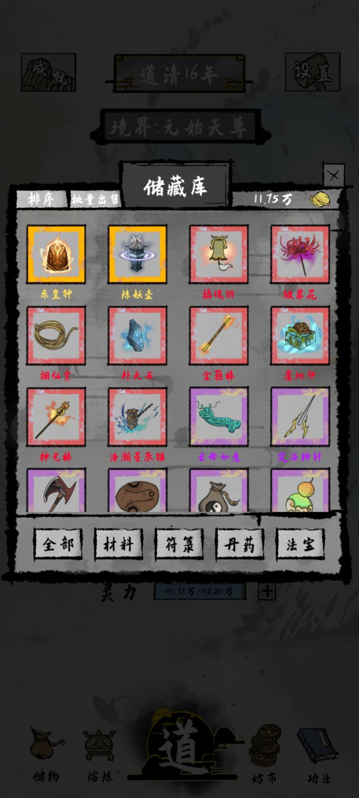 通关秘诀就是第一个存档玩炼器!有个突破天赋炼器必然进阶。3紫2蓝可以练出一个红色!3红装备好把所有非红色装备卸下出售。每次渡劫与BOSS战都清理一次法宝!保证即使输了也能保底3红开局。记住每次一定要点神转世天赋!不然法宝属性不统一不方便佩戴。不要点每次放过一个敌人加5%生命的天赋!除非你是光头。不然后期打心魔渡劫会因为输出不够自己死在雷劫下!毕竟雷劫是百分比扣血!而心魔和玩家一样属性