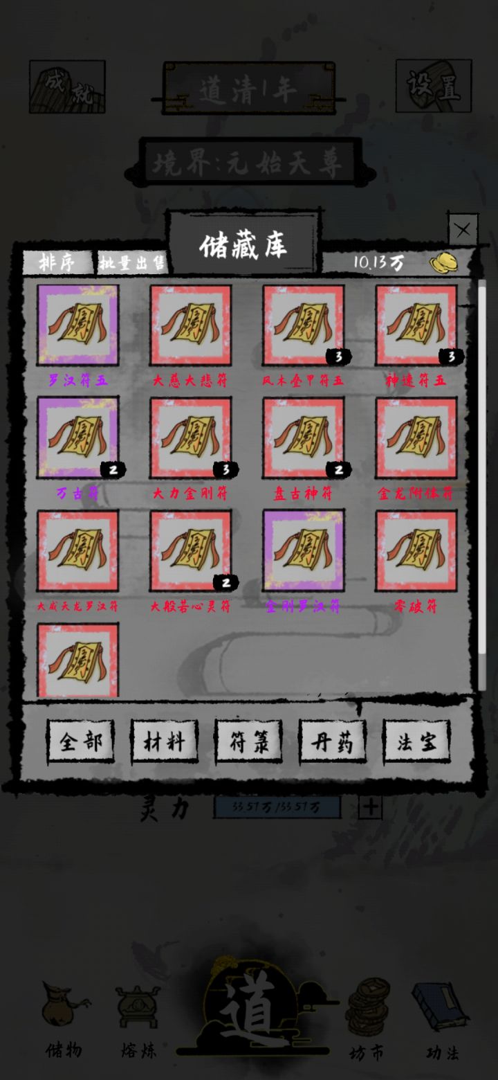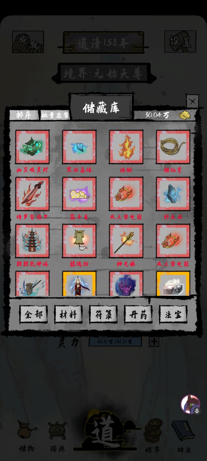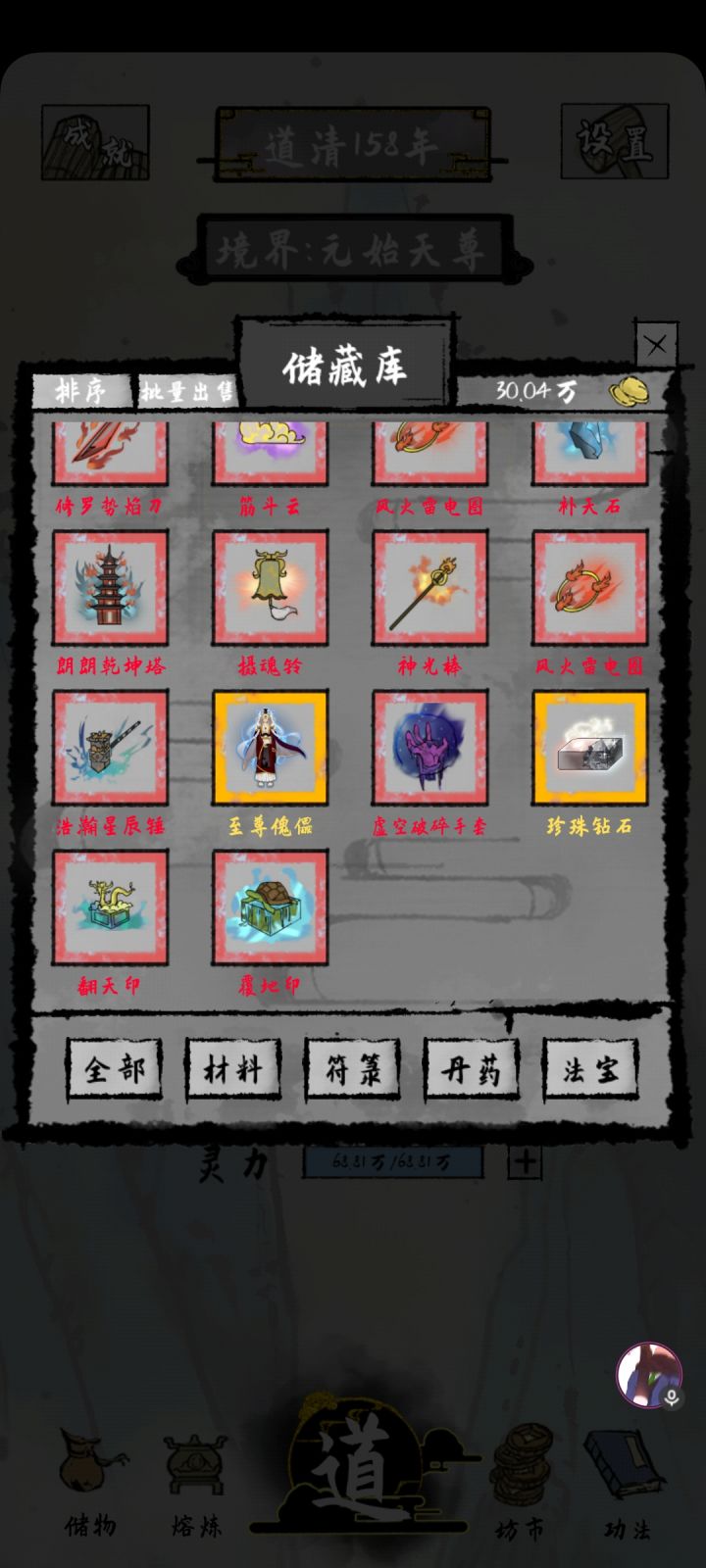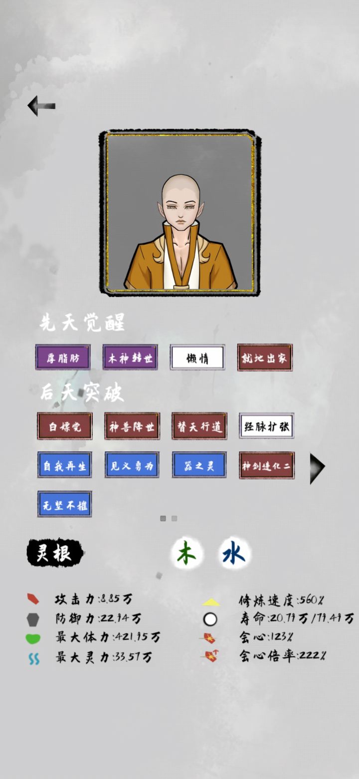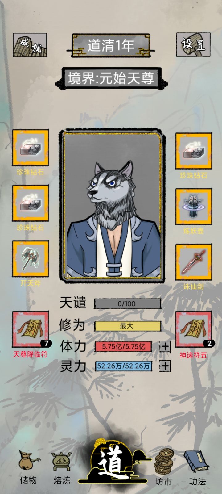 因为天降神器的原因导致我前期异常艰难,好多装备不能用,被迫成为狗头超人,下面是我成仙前后属性,和吃完丹药的情况,还有一些先天至宝这是秘境获得的进阶天尊前进阶天尊后加上吃完丹药的属性还有一种丹药不敢吃,吃完就没灵力了开局选的天赋因第三个天赋,天降神器导致炼器之神没法用,前期也很艰难属性高的原因,有上一把继承的一些丹药,最好是有寿命和攻击的丹药保留到下一次,还有天赋很重要剩下就是四个先