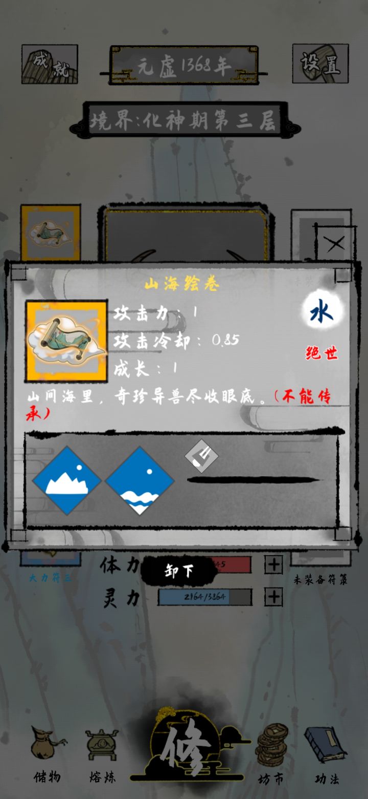 神器山海绘卷,对战背景为山加防御。背景为海敌人每秒减少百分之五血量,天降神器突破嘎嘎难用给个神器然后不能用神器以下法宝