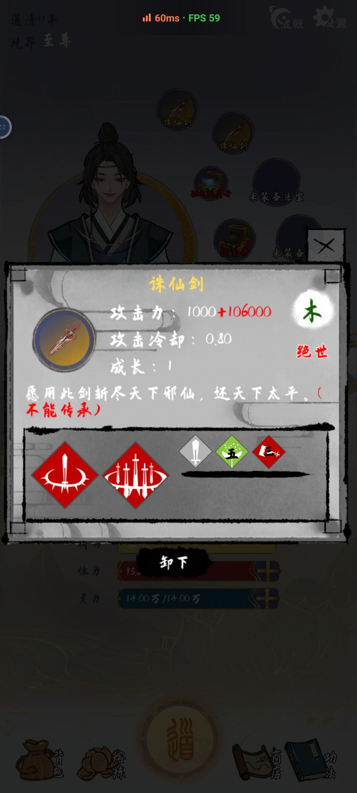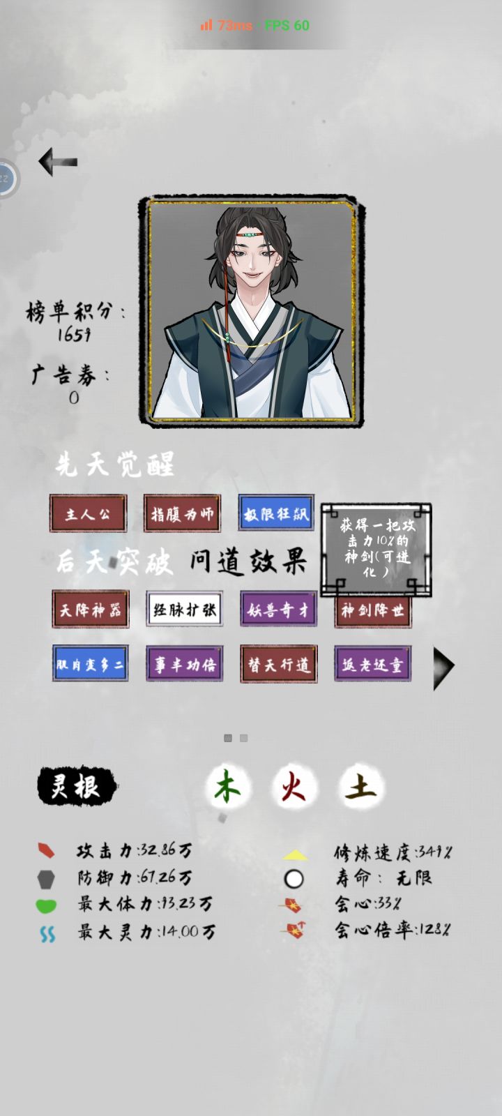 稳过关(只要别作死)1 角色用和尚(可以提升修为速度,后期很难提升所以很有必要用它)2 天赋刷霸王神拳,符箓大师(灵根越少越好)3 (可选项,如果有一定要选)后天天赋有符箓道神一定要选!如果有光之意志也要选4 做完这些就收集强的符箓,打架的时候把左边一栏的符箓全点掉(你有符箓大师不消耗任何符箓)5因为你拿的这两个天赋所以你的功法,丹药,法器都无法使用但也不需要使用。一力降十会(点完符箓滑