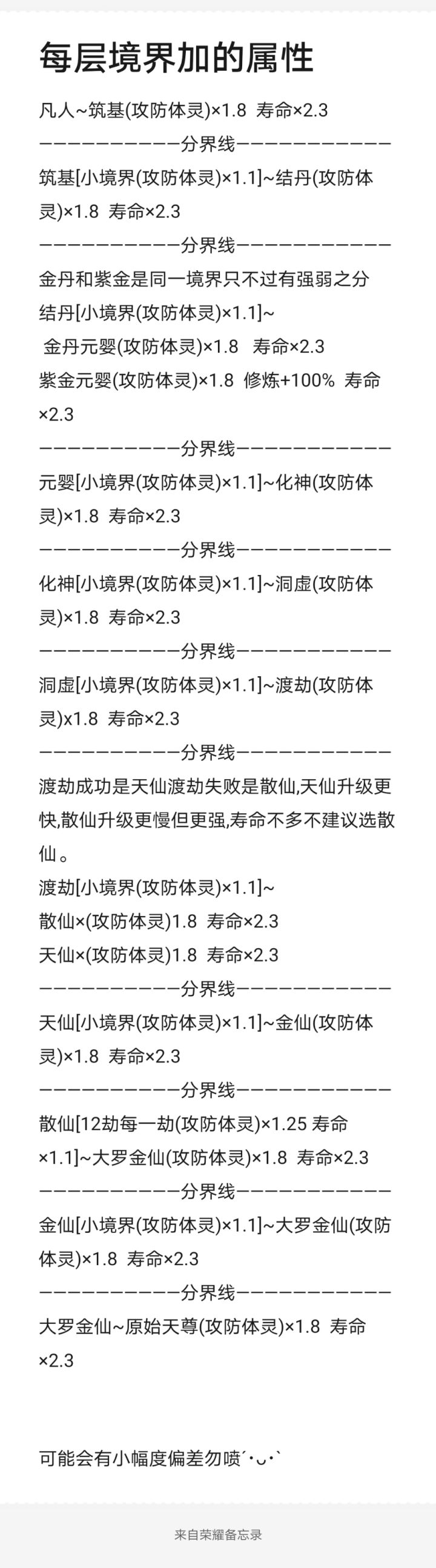 散仙[12劫每一劫(攻防体灵)×1.25 寿命×1.1]~大罗金仙(攻防体灵)×1.8 寿命×2.3
