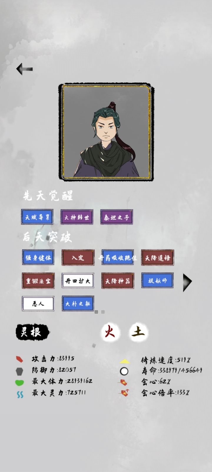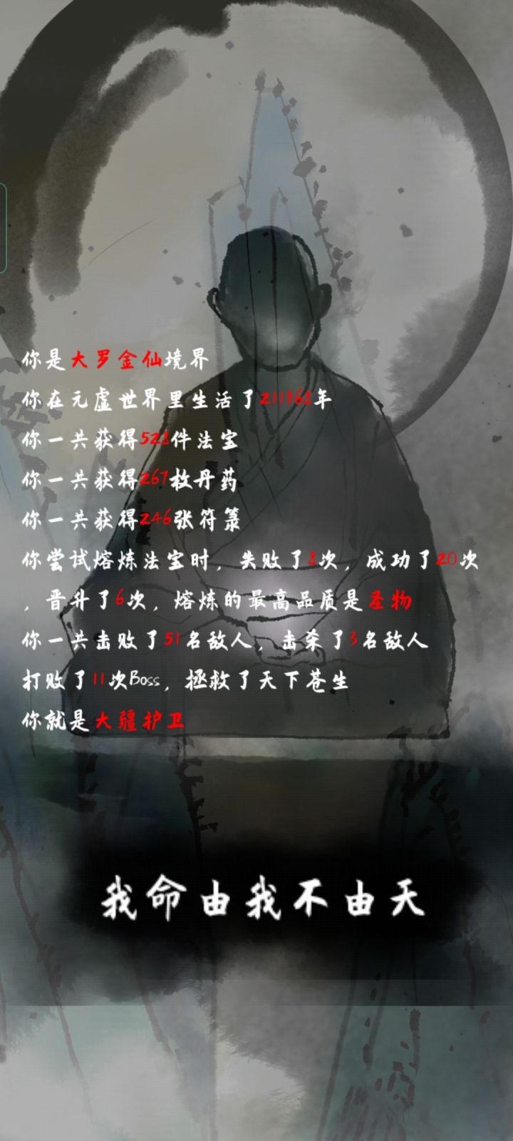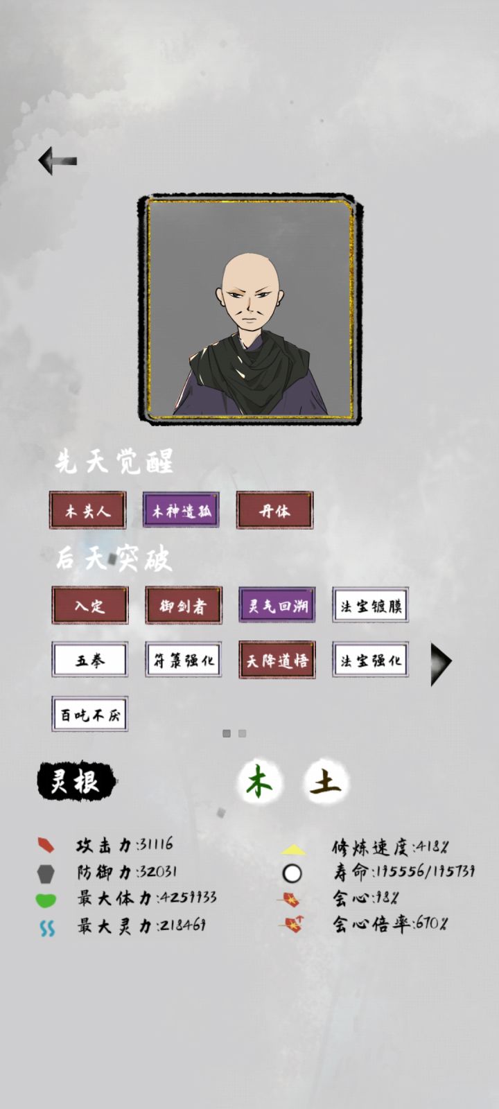 符箓大师开局,尽量要修炼速度和木头人。符箓道神是关键,天尊降临是质变。后期升级没有太好选择,导致寿终正寝。欢迎大家尝试
