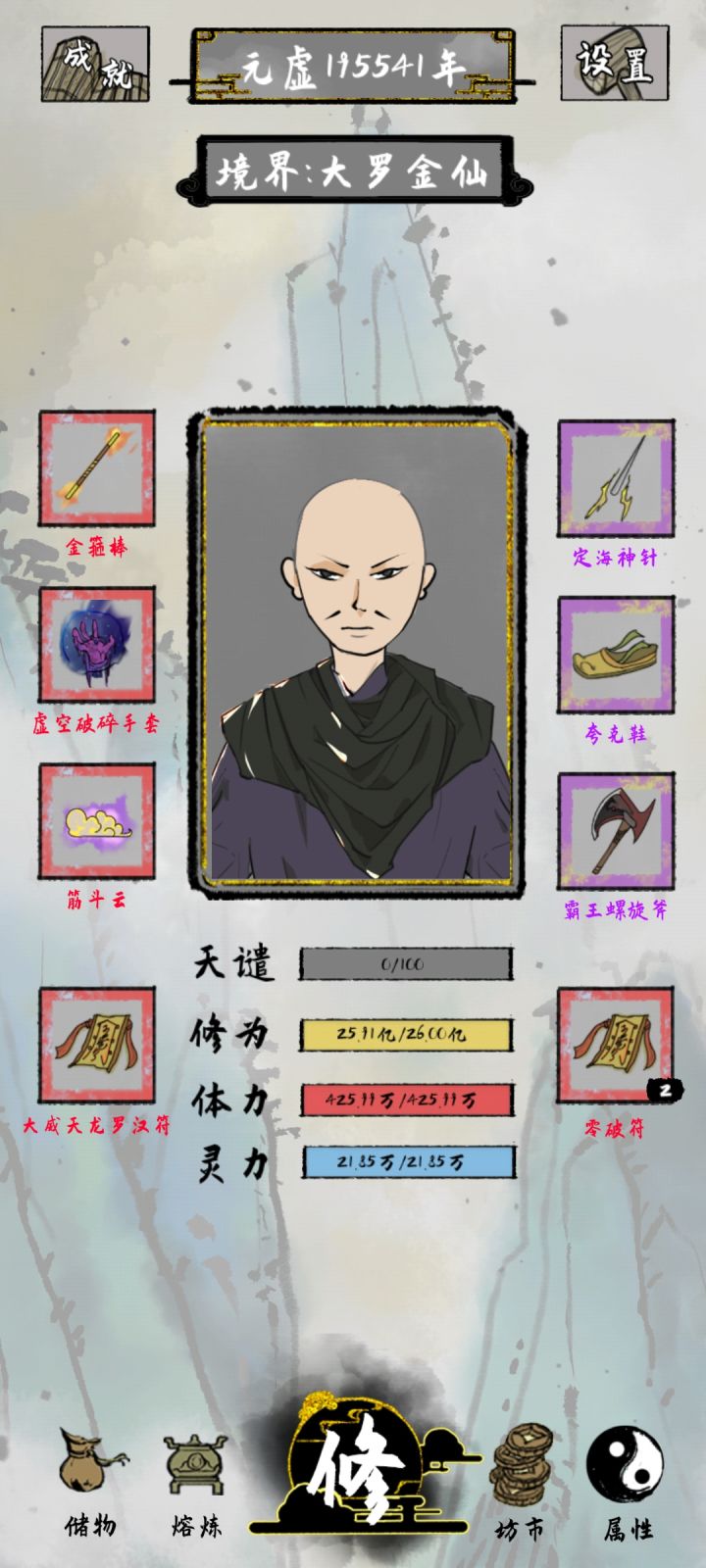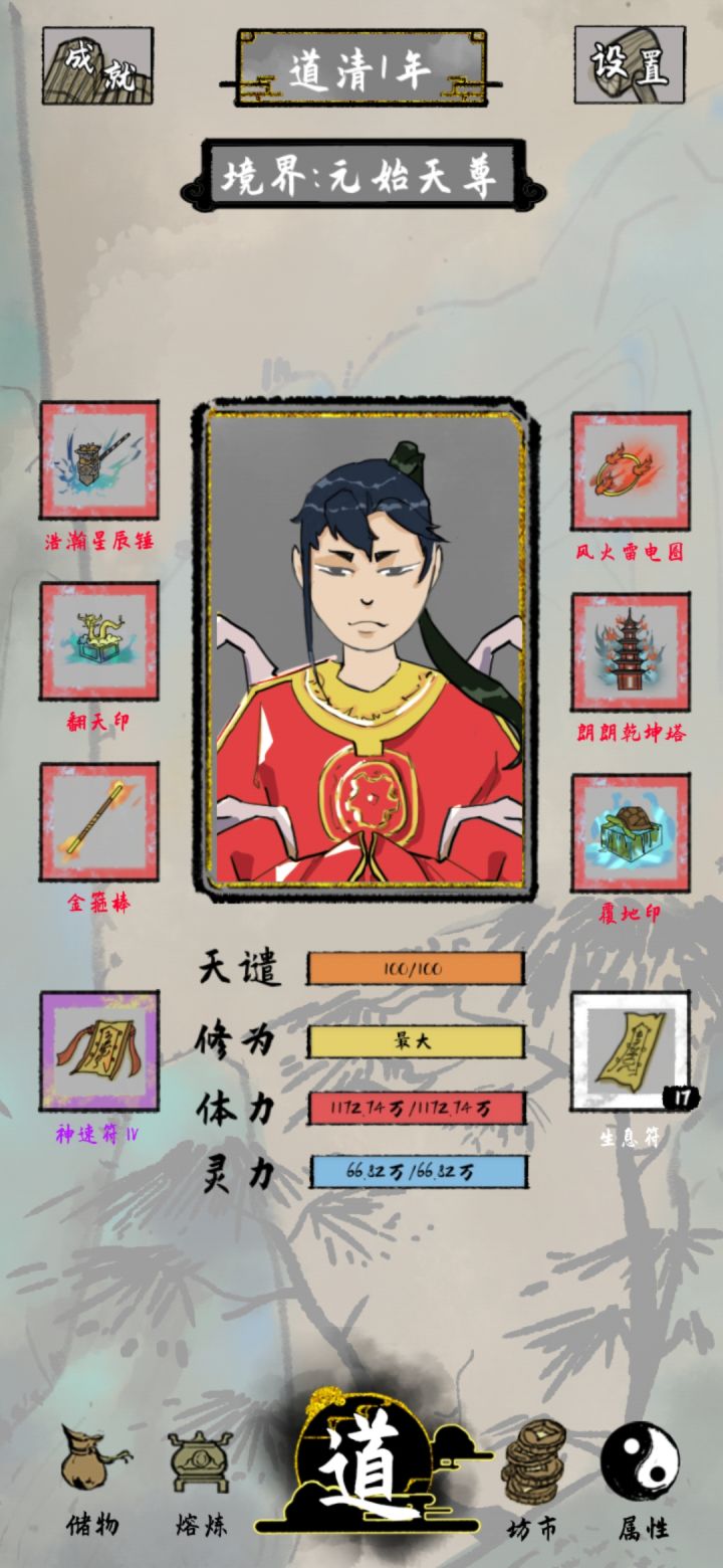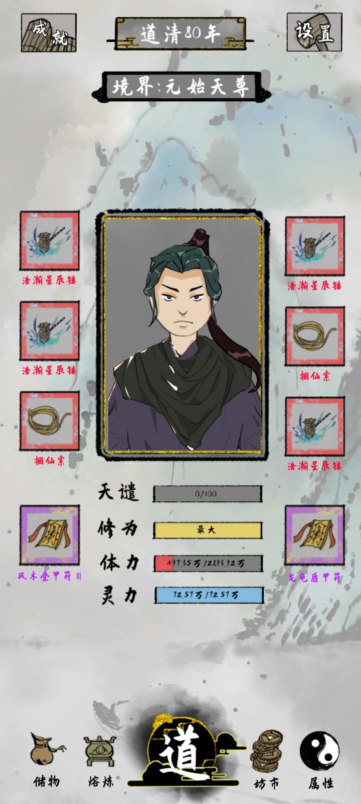 符箓大师开局,尽量要修炼速度和木头人。符箓道神是关键,天尊降临是质变。后期升级没有太好选择,导致寿终正寝。欢迎大家尝试