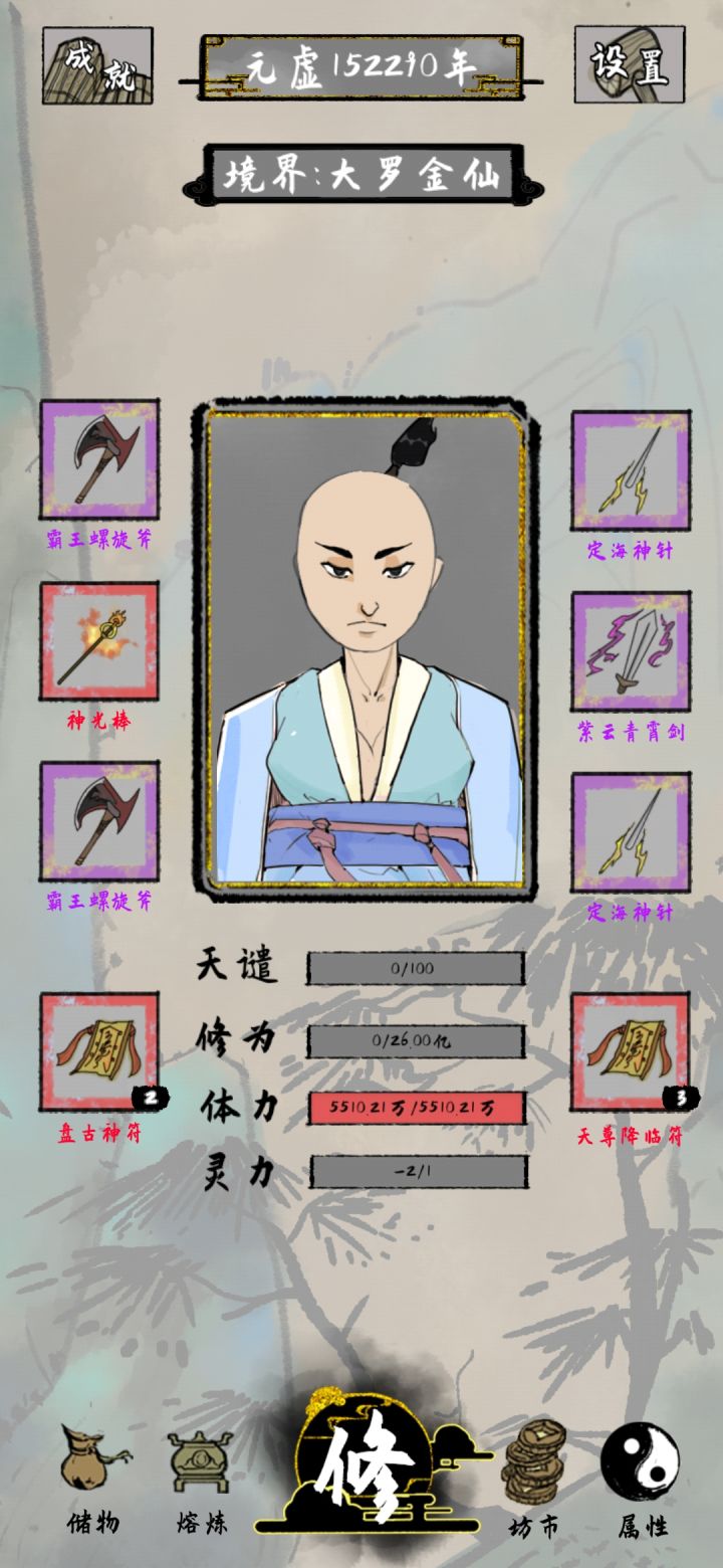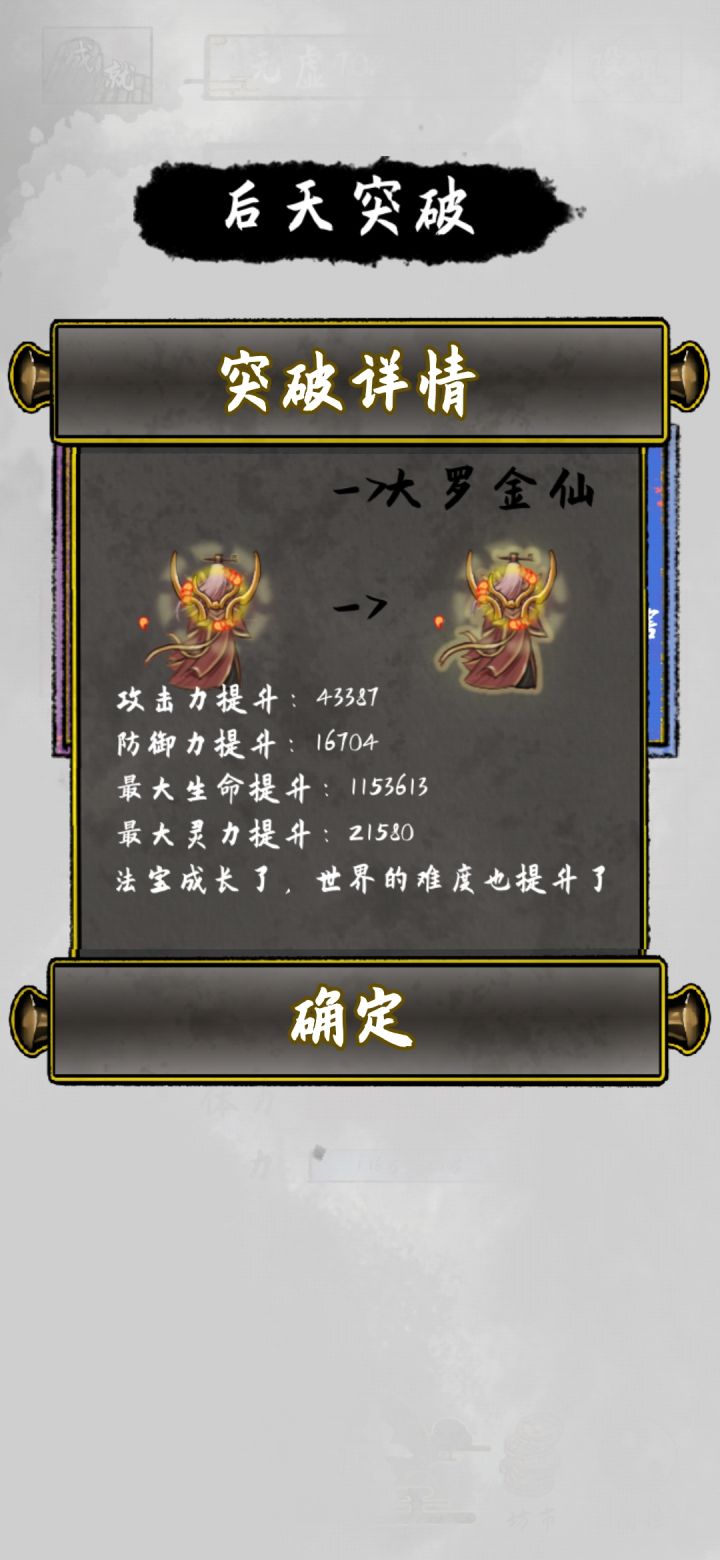 之后是寿命 多屯丹药 寿命修炼效率的 然后元婴期及以后一旦刷到修炼阵拉满!拉满!拉满! 说三遍 平时多屯灵石 尽量就买丹药 如果在你到大罗金仙的后期过不去了 啊就像我刚刚这样 到大罗金仙没寿命了 最后一个圆满期 刷到修练阵了 别犹豫 直接把身上装备卖了 换灵石修炼 然后就通关