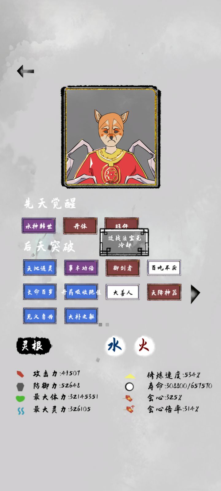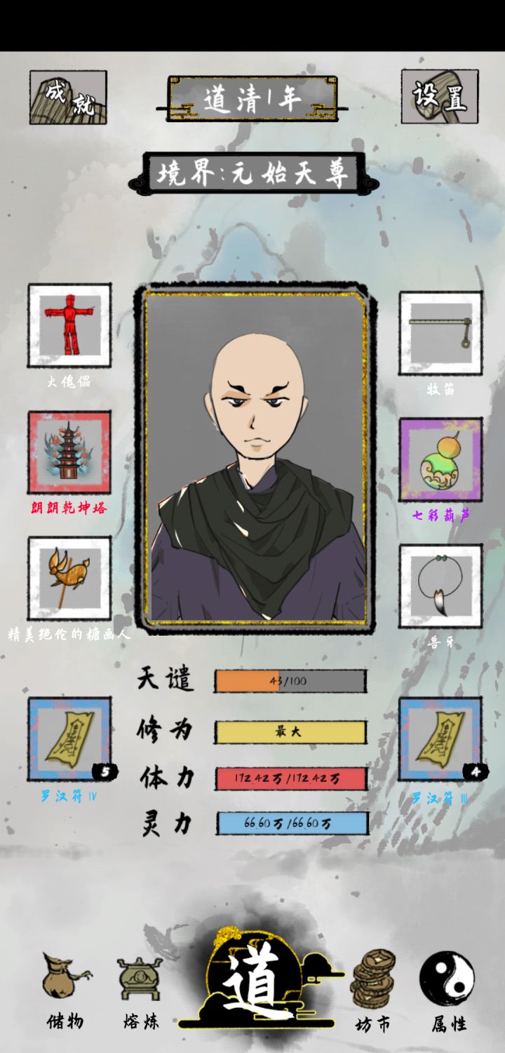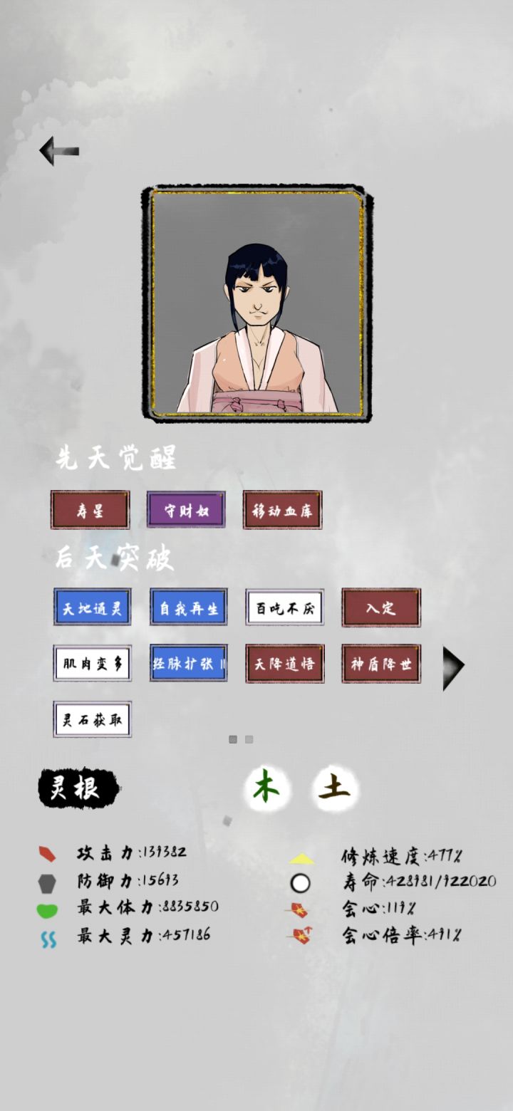 初始天赋 木头人几乎是必选的 或者旺财丹体 木头人 配寿星丹体旺财都可 或者还有一个减耐药性的 忘了叫啥 这个游戏寿命 和修炼速度最重要 二三灵根开局就好 后天突破天赋 最好点加修炼速度的 玩久了之后 成就里头会有加成,可以尝试新思路别的一些玩法。。传承最好是武器 遇到不容易死。。1,不用的装备及时卖,碰到修炼室直接拉满 不会溢出,最多在你当前等级的最高处2,丹药能吃就吃,用不着的就卖,要不然