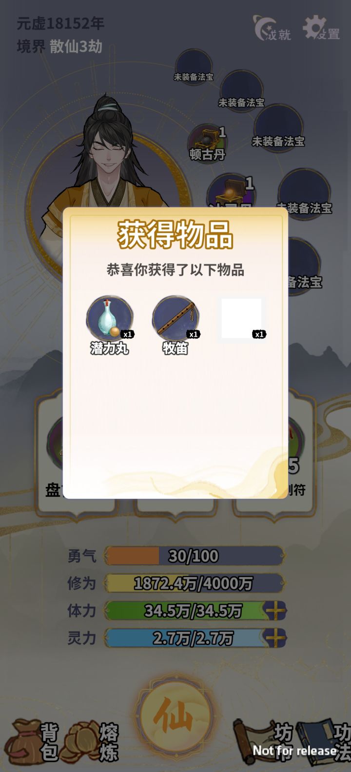 使用那个随机变换属性的丹药复活之后,时间就超过去了,现在没办法继续点“战”,但其他的功能都可以点开,也不结束游戏