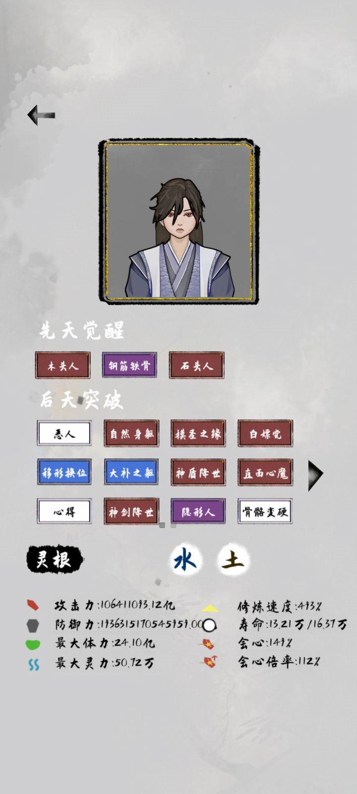 如图,我的数值高的吓人。因为有自然之躯,所以算是体修路线。绝对没开挂,玩这游戏实在没必要开挂结果我好不容易玩到散仙十二劫,结果卡在了机遇事件里了不管点取消还是确定,我就动不了了。这个号就莫名其妙算是废掉了。这算是bug吗