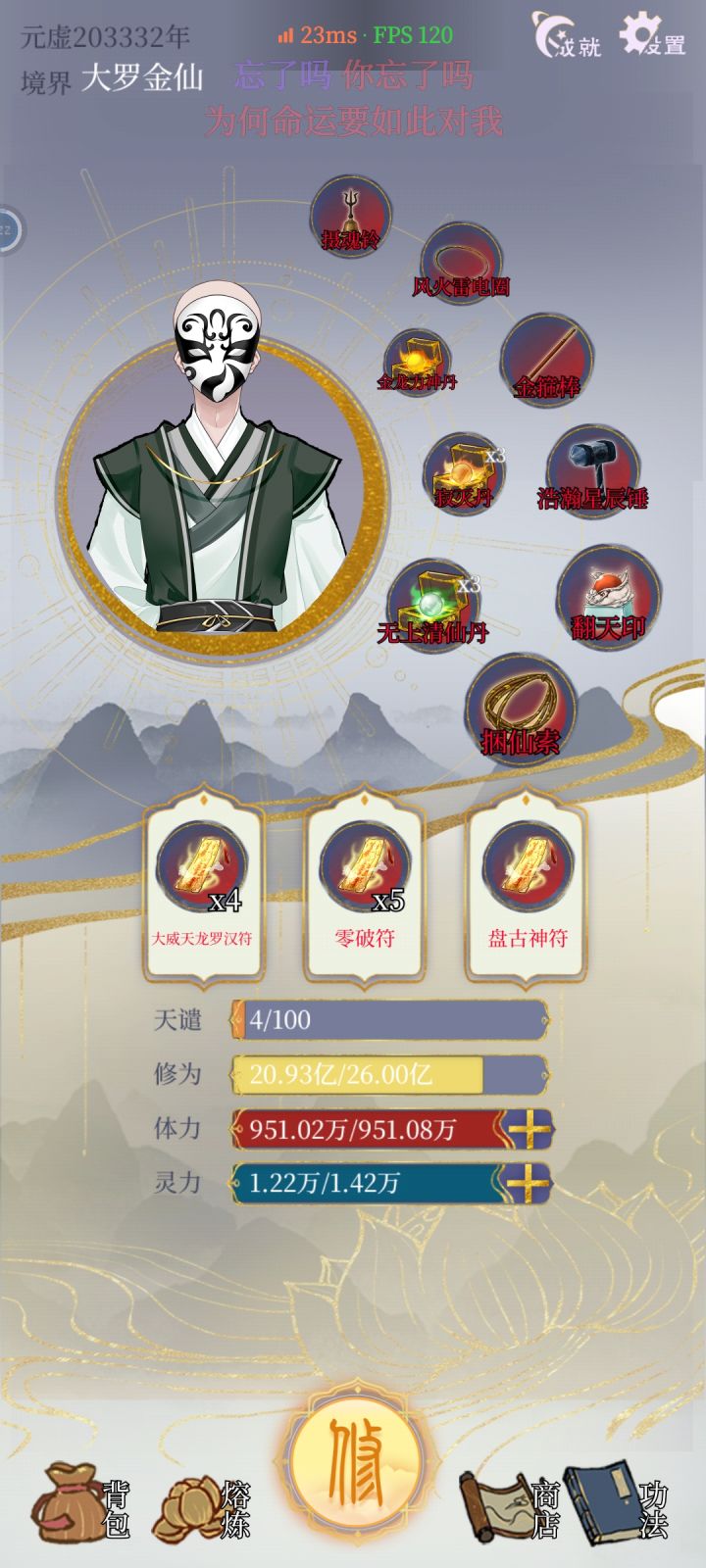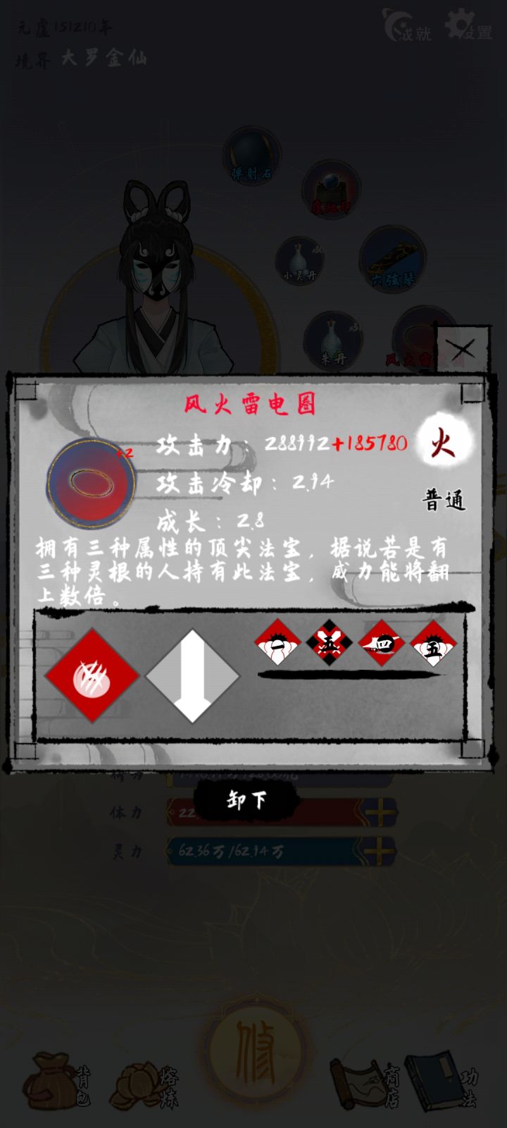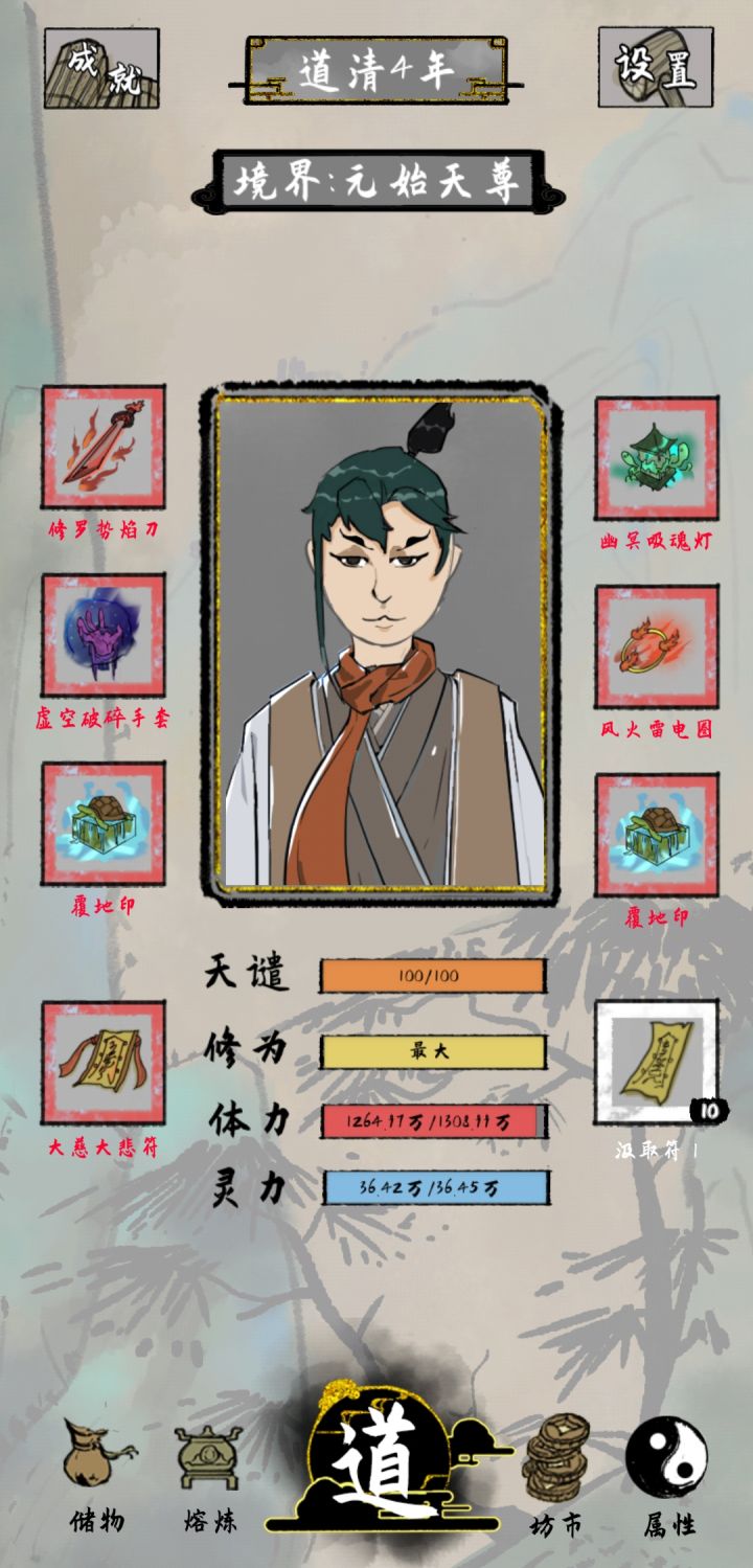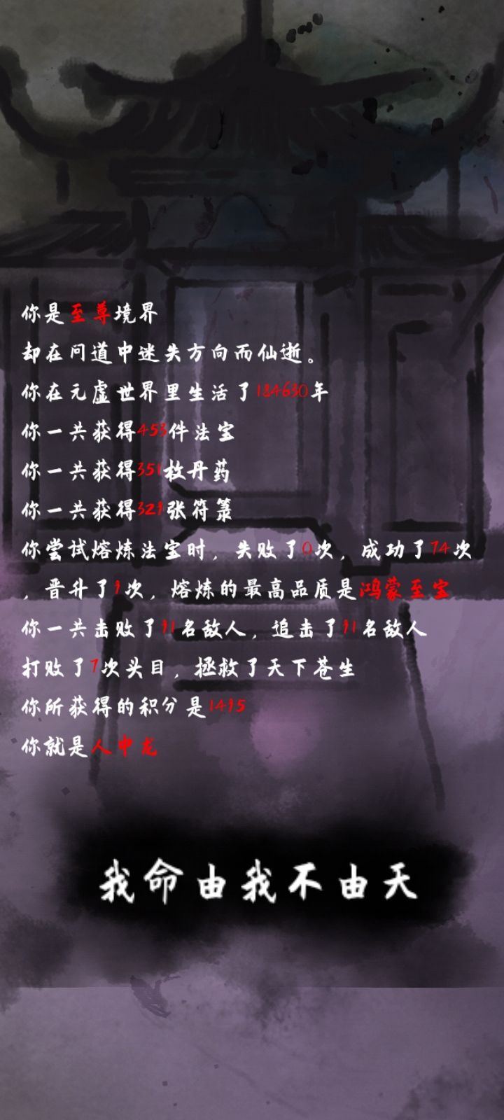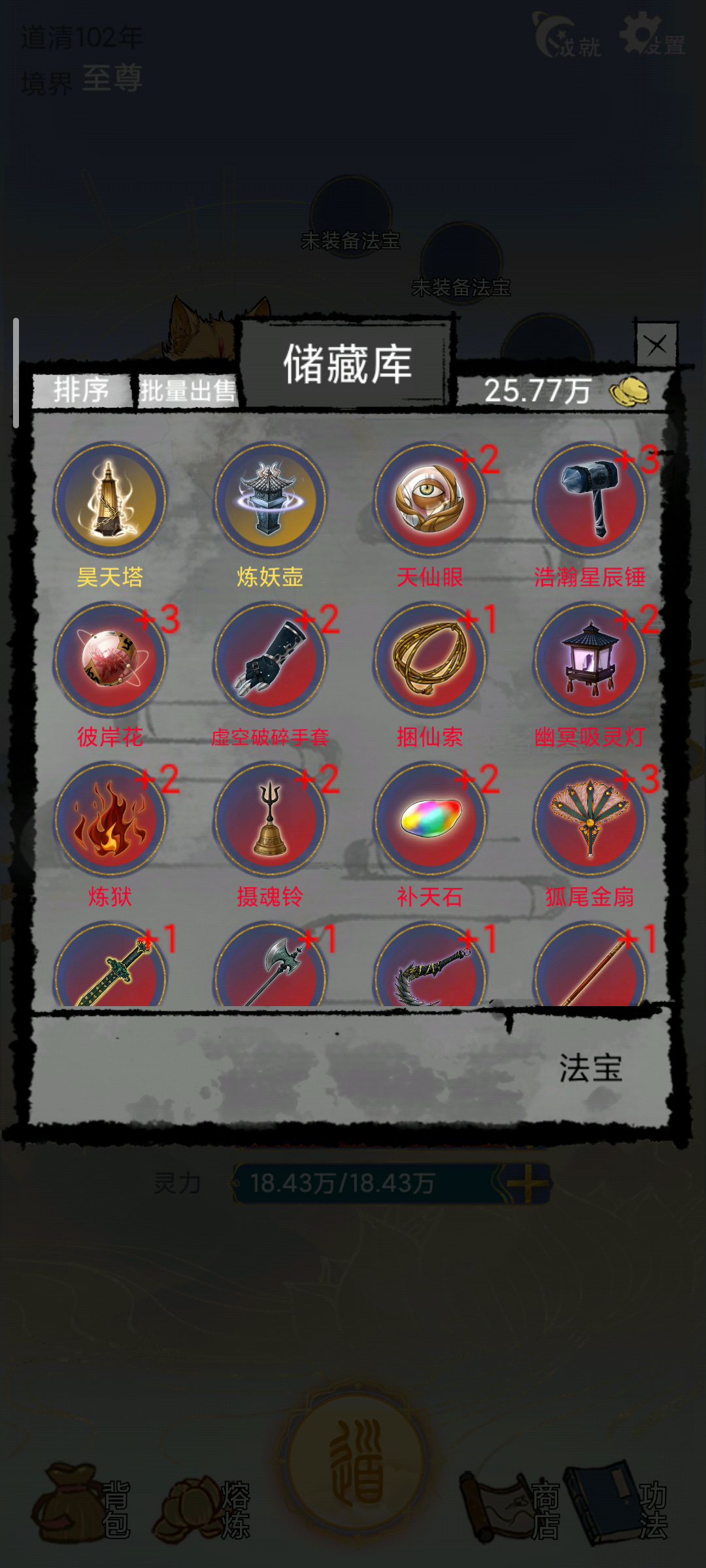 把所有法宝都不卖,学了后天天赋炼器之神,问道运气不好,开局就是四个红选项,抽中近战反伤100%,努力以后达到100+层,实在打不动了。然后就是炼器操作😅简直不能太爽,最多的应该是紫电剑🗡️差点点+5