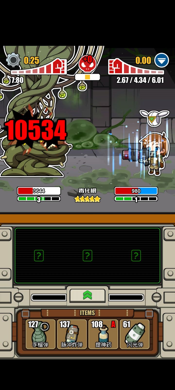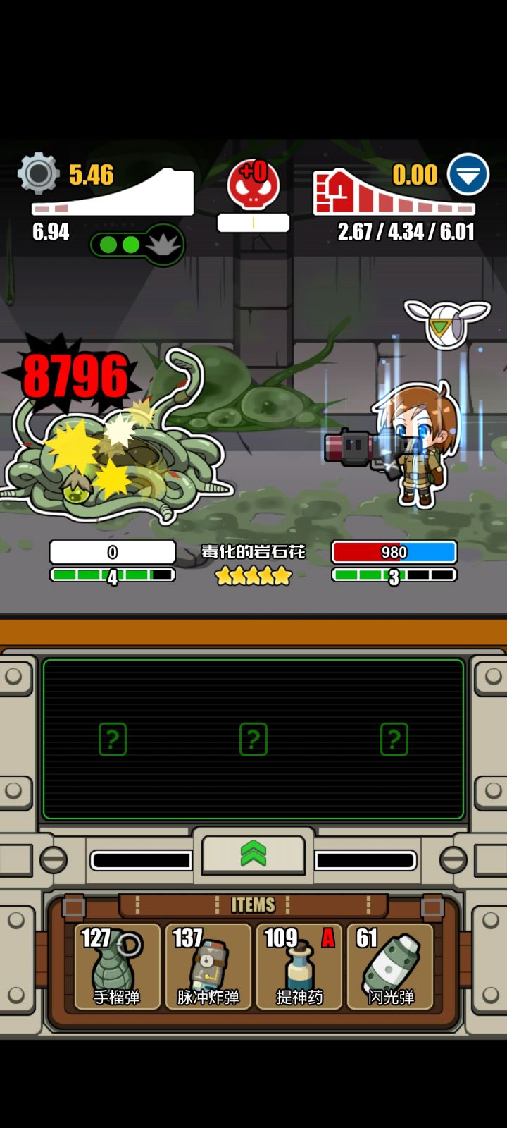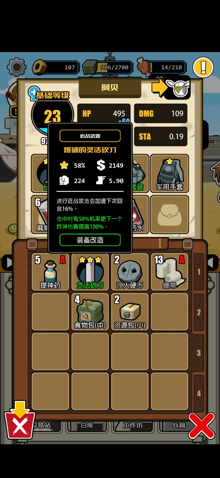 再说卡牌和装备吧,我打的比较稳所以我带了护甲片和军用套装升满品质护甲伤害减很高武器我用散弹枪因为伤害高品质升满级敌人满血伤害加30%配合瞄准射击可以秒大多数和自己同星级,出手没你快,第一回合不给自己套减伤的怪物,怪物2星以后一般都有700-1200的血量也有一些600血的弱鸡怪物,3星的我去地下要塞打过一次有2500多血打不过就没去了 ,哈