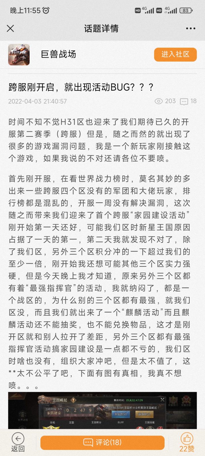 角色ID: 4f3wqe区服:S27-帝国崛起角色名字:无聊仙人王国战的时候,每个堡垒容纳上限是否能提高点人数?我们军团百来人,一个堡垒容纳20人,开了一堆buff没挤进去…最后在那看热闹,我玩个啥呢??每次堡垒几乎是不加速就没得玩,这游戏无处不在让玩家氪金。以前也玩类似的如《战火与秩序》《率土之滨》都没碰到这种情况啊…