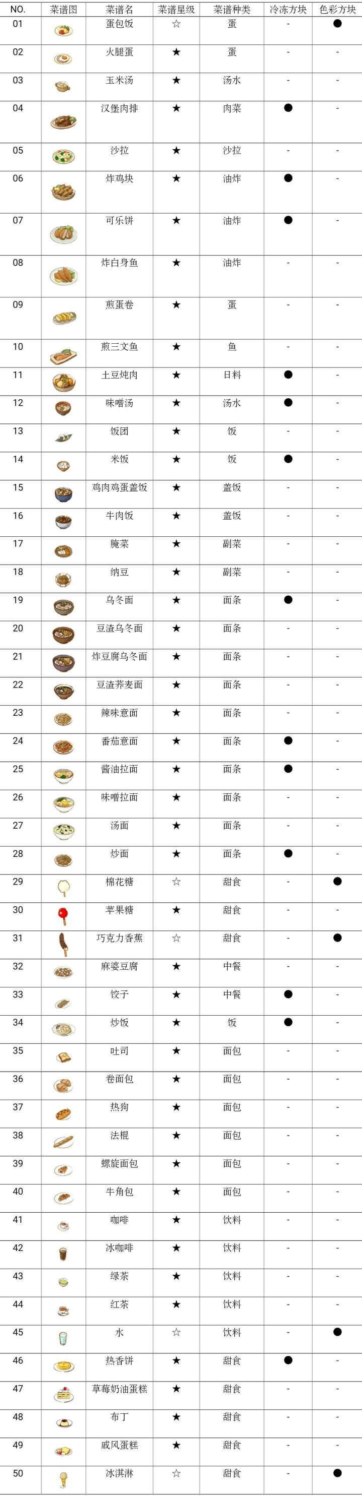 ▪ 本贴提供的菜谱数据是在论坛里的这篇早期的帖子 的【二、2.1】节提供的食谱列表的基础上,补充标注记录了带冷冻方块的菜谱、四星菜谱的基础数据、所有菜谱的初始完成度数值、所有可变色菜谱的变色版数据,并修正了我注意到有错漏的内容。▪ Excel版数据见: (有两个工作表,第一个工作表是全菜谱的记录,第二个工作表是变色版菜谱的单独说明。)表格可以下载,并且我个人推荐把表格下载下来用,因为网页版的表格