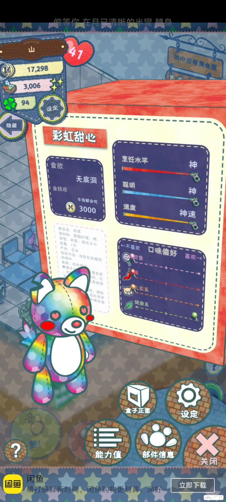 当你很难从顾客身上获得好评时,最重要的是食谱,也就是卖的菜。所以怎么才能搞到好的食谱呢?获取食谱绝大多数来自超市进货,所以等级一定要先尽量升高,解锁高级食材,得到稀有食谱概率就越大。提高等级就得抓布偶,然后神秘商店拼部件。拿到稀有食谱之后,你还得有一只烹饪和聪明的能力很高的布偶,这个可以攒三叶草直接挖角,或者抓布偶时看见好一点的用三叶草提升能力。注意这个食谱最好是冷的或者辣的,因为现在流行。之