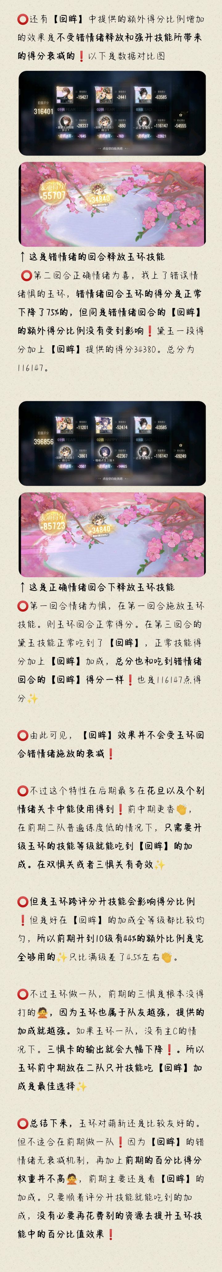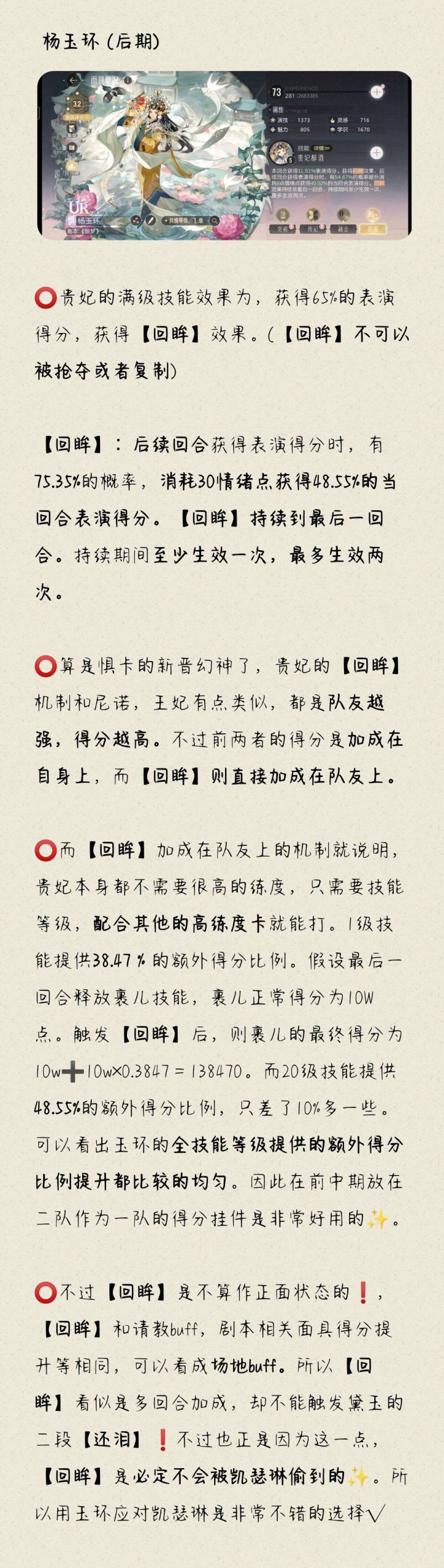 ⭕(没错,本咕咕偷偷产出了)⭕ 排在T1的强度,但是不适合在前期做一队🙅⭕ 新卡和尼诺类似的机制,队友越强则效果越强。只不过尼诺是加强自身,玉环是加强队友⭕ 技能效果比较特殊,可以在错情绪回合上场也不影响部分技能效果✨ ⭕ 强升技能在正常情况下不会影响回眸分,但也有特殊情况会影响到。后续可能会再开一帖说明一下⬇️具体看图#攻略#绝对演绎#游戏讨论#强度榜#角色强度