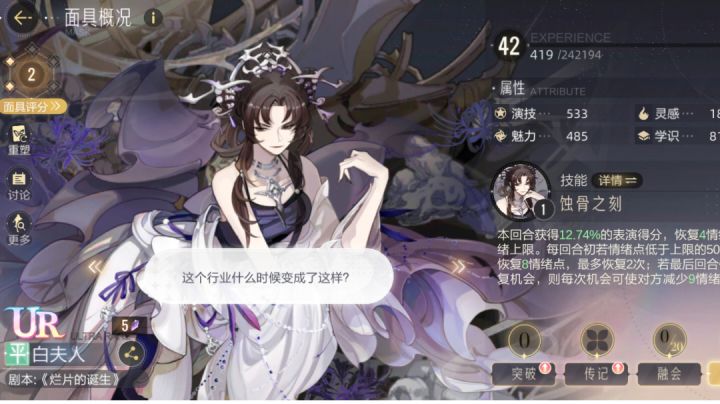 ⭕平卡强度榜·上篇在这⬇️,建议搭配上篇一起食用喔💖⭕PS :好久没更新了,咕咕咕一下⭕以下攻略没有考虑叠卡,因为每位女明星叠卡情况都不一样❗宝子们食用时还得根据自身叠卡情况来考虑喔✨⭕以下面具无特殊说明,融汇都是洗学识!T2.5💓2.白夫人⭕前期仓管,后期发力的笨蛋美人💓,技能效果为本回合恢复一定情绪点与上限,且每回合初情绪点低于上限的50%则立即恢复一定情绪点,最多恢复两次,若最后