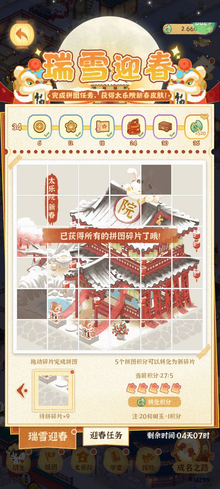 我的拼图还缺两个,目前显示已有的9个碎片全是重复的。还有多余的拼图积分,转化新拼图告诉我,我的拼图碎片是全的,但是事实上还有俩个没有,麻烦查看一下具体情况哈id:142319