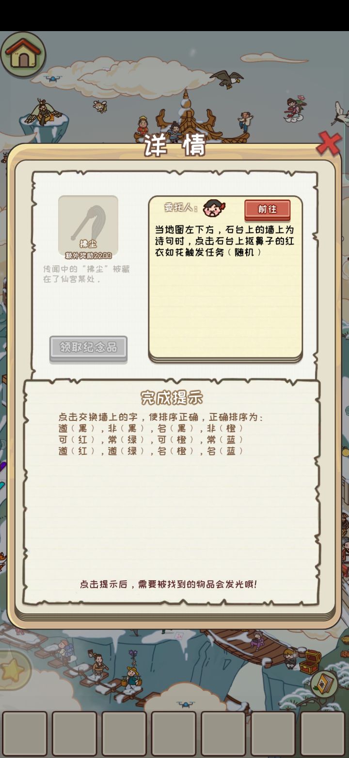 〈黄圈是委托人〉甘肃 敦煌【披帛】点灯神,选女的,漂亮的。【神烦狗像】地图上有一个宝箱点它,密码是9731。【青鸾羽毛】青鸾会不定时在上面飞过,看到点它就行。【定风珠】把两只蜥蜴点到洞里↓↓↓【神剑】【洮砚】【飞天琵琶】【工艺骆驼】【飞天彩塑】点进去【庆阳香包】【夜光杯】把蜡烛弄灭【葫芦雕塑】【防晒霜】在箱子里,我收集了所有才没有的【胡杨木梳】【金刚舍