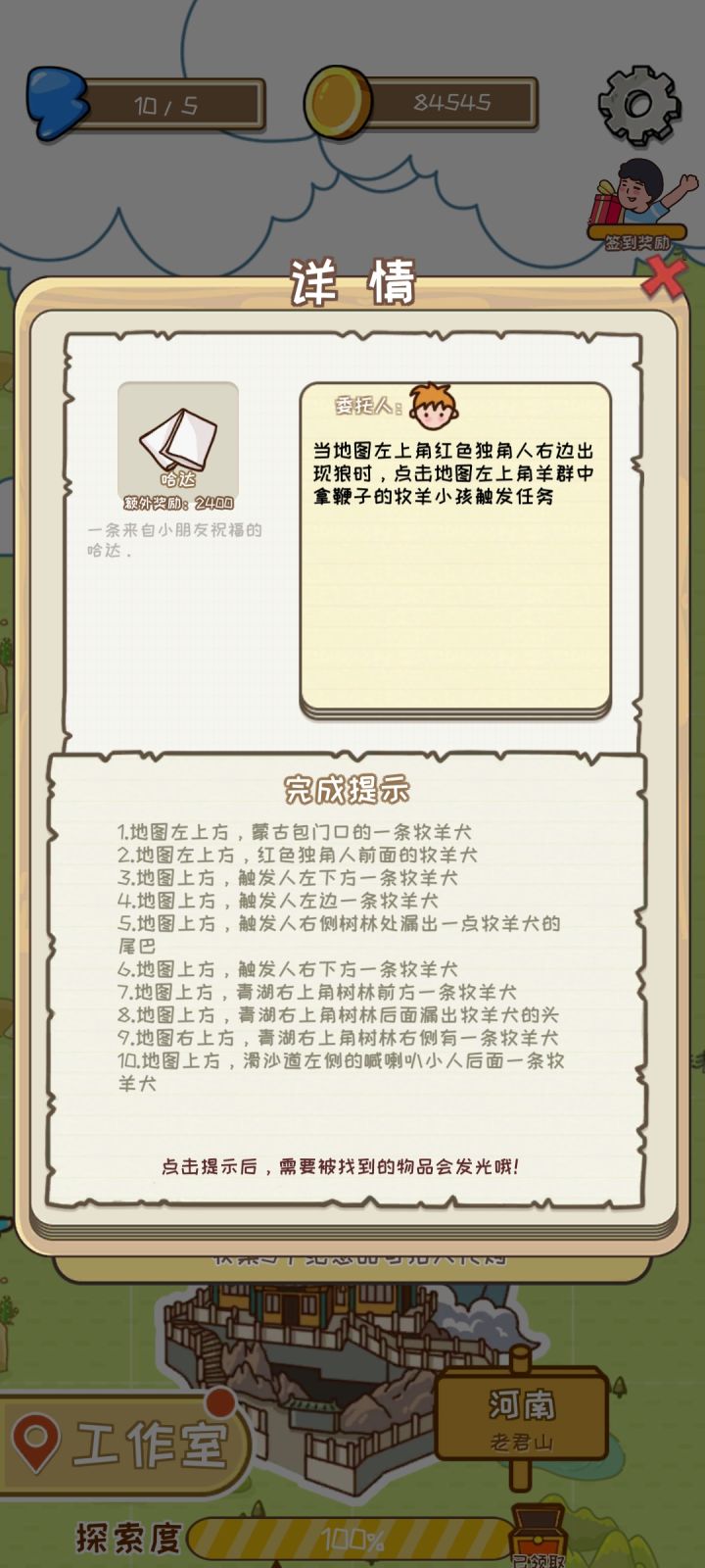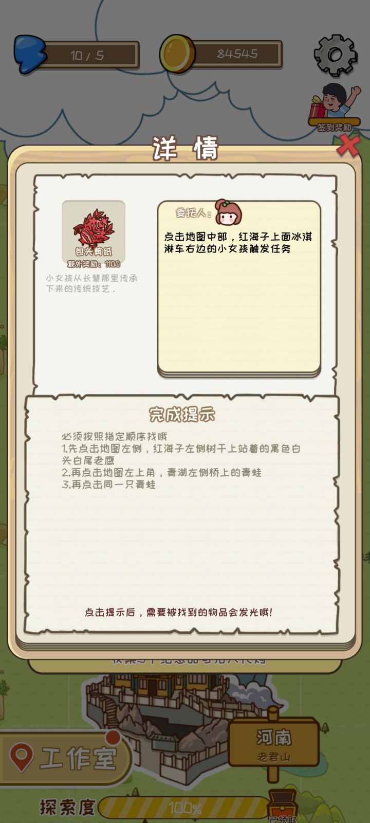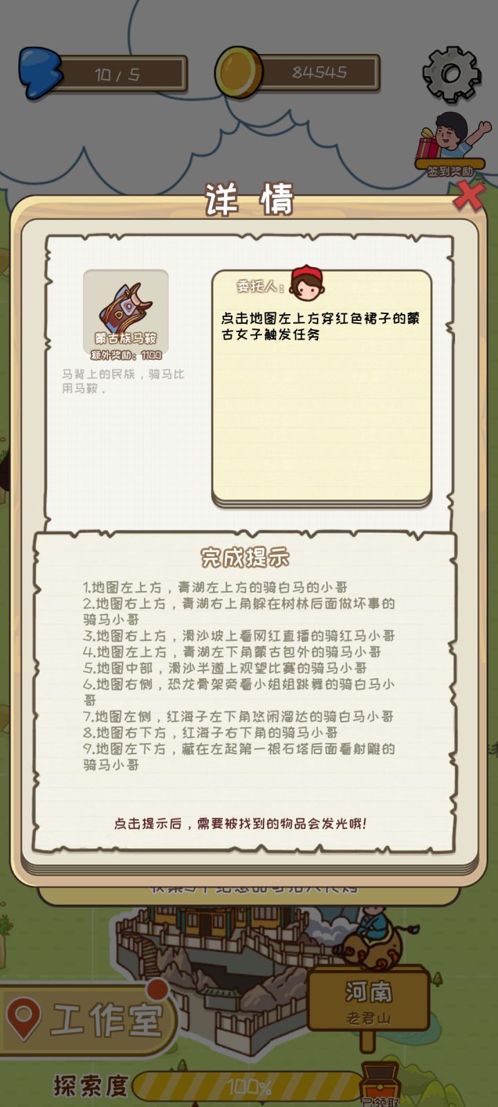 快速赚金币的方法做委托,做困难的,把图里小人都点一遍,物品尽量也点,找不到的右上角有提示,用光了提示就看广告刷新,做完之后点双倍金币,困难任务一次给一万金币