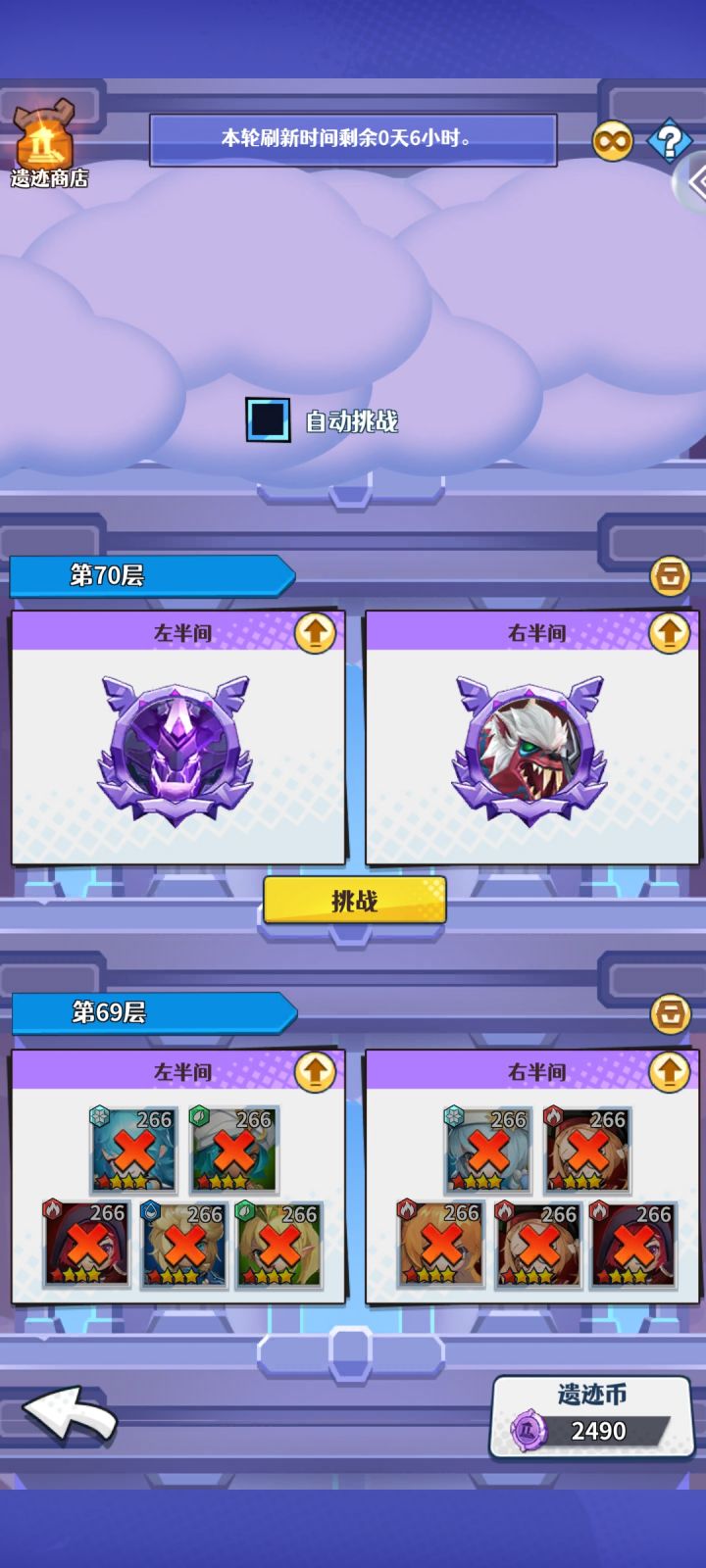 遗迹探索:分两队进行挑战,两队总耗时不超3分钟,非只有3个位置,会随进度最高各有5个出战位置,队伍等级为主力队最低等级,受神器,刻印,装备,宝石等影响。每半个月刷新重置,下次开启挑战层数为上次最大层数-10,。玩法:主c,副c分开各一队,调节好队伍后自动挑战,一般卡boss图。遗迹商店优先攒币买幸运自选券,其次是英雄圣水,最后是高许,优先保证每次能兑换幸运自选,有多余再考虑其它。 元素塔:分