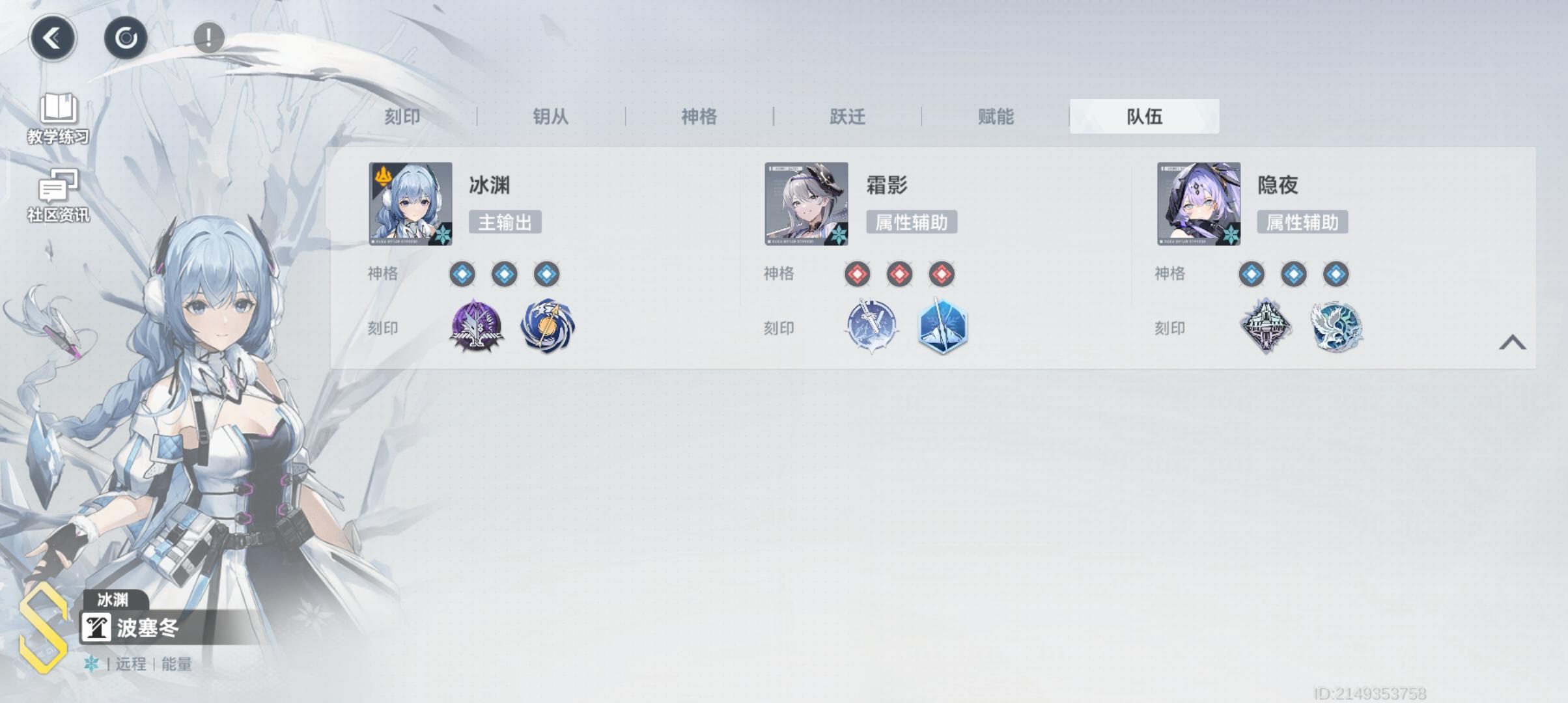 算上今天,我是玩了10天的萌新,我想问一下第一张图片的冰队可以用多久,还是后面镜花黄泉返场把她抽出来换掉冰渊,提升队伍的强度;然后抽魂羽池30抽歪了黯耀薇儿,现在还差13抽就大保底出魂羽,大佬们不用担心,但是我想问一下再过几天潜质觉醒就可以整完给薇儿升到2s,然后想问一下到时候光队用不灭跟魂羽搭配,还是跟黯耀跟魂羽搭配,或者3个直接一队;目前就这些问题了,大佬们有其他更好的规划也可以给我指导一