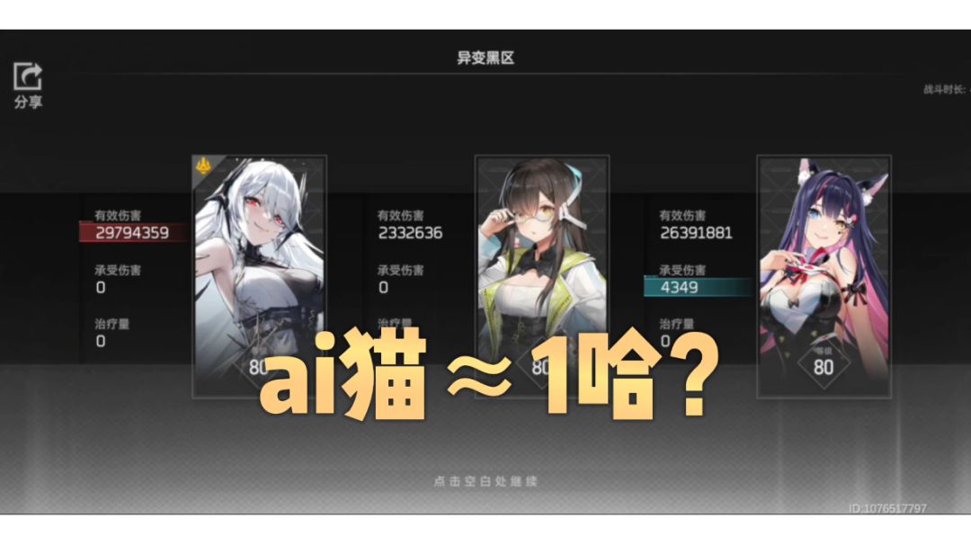 伤害结算: 哈迪斯2979w 猫猫2639w 配置: 哈迪斯2S满破四星通武满跃迁 猫猫Ω1专满跃迁 海姆Ω2专 这里为防杠精先说明一下: 首先欧米茄A对标SS限定没啥问题吧?我哈迪斯是有专的,不用并不是为了偏袒猫猫,而是在跃迁后专武打不过四星通武,且哈迪斯手控的操作也并没有任何故意拉稀、以及故意不吃海姆拐的情况(视频就在这,你们可以审视一下)甚至猫猫还给哈迪斯打工,提供了左线的36减暗抗,她真的,我哭死 结论: 猫猫并不绑定奖励姐,也不绑定双辅(她只绑定专武),她还可以作为一个非常强力的ai队友去辅助任意暗系主C(哈迪斯、胡狼、海拉) 个人感想: 老实说这个结果我也没想到,思来想去也只有一种可能了,那就是ai猫会打背击百爆! 总之,猫猫无论是作为主C(翻上个猫猫视频)又或者ai副C,她的表现都是相当亮眼的,而练猫猫的成本也只需要你给她抽一个专武(性价比极高,平民之光),现在想跟着我练左线猫猫了嘛?