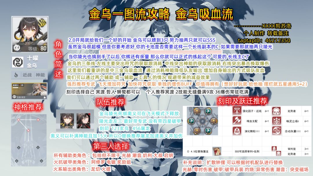 暮起云歌攻略 金乌一图流攻略 金乌吸血流 写在前面 合理讨论 切勿引战 和谐 论坛 从我做起 首先你要觉得的第一件事 是金乌陵光要不要抽。你缺不缺c 缺不缺长线c 想好了 再说 不然不推荐无脑 金乌 既然玩了金乌 专武质变 为什么不抽? 有专武连招 进图2 获得3符咒 飞天获得5符咒 以后A出第九个符咒。然后 1。有2点2 满符咒就1 有奥义点奥义。飞天模式普攻别断 刻印 跃迁 自适应调整 不是