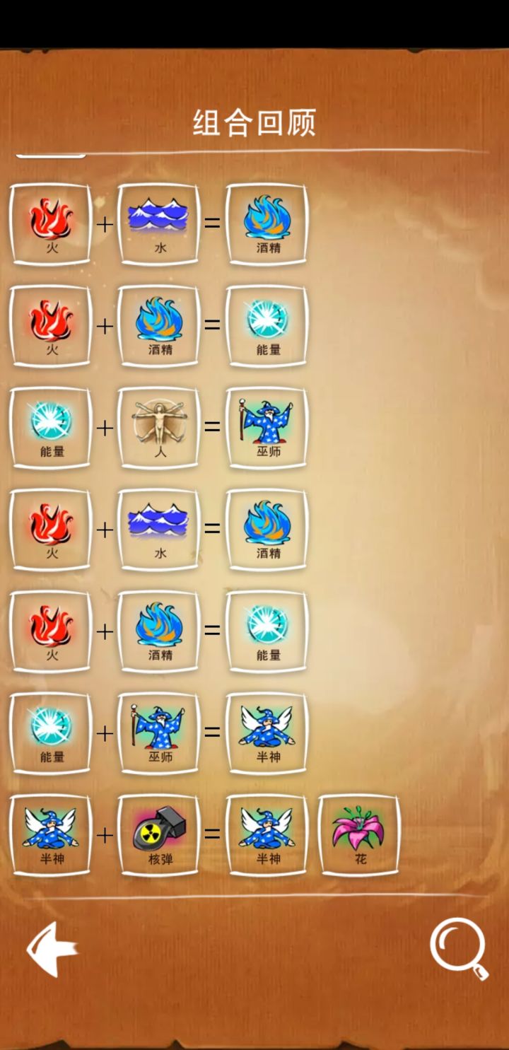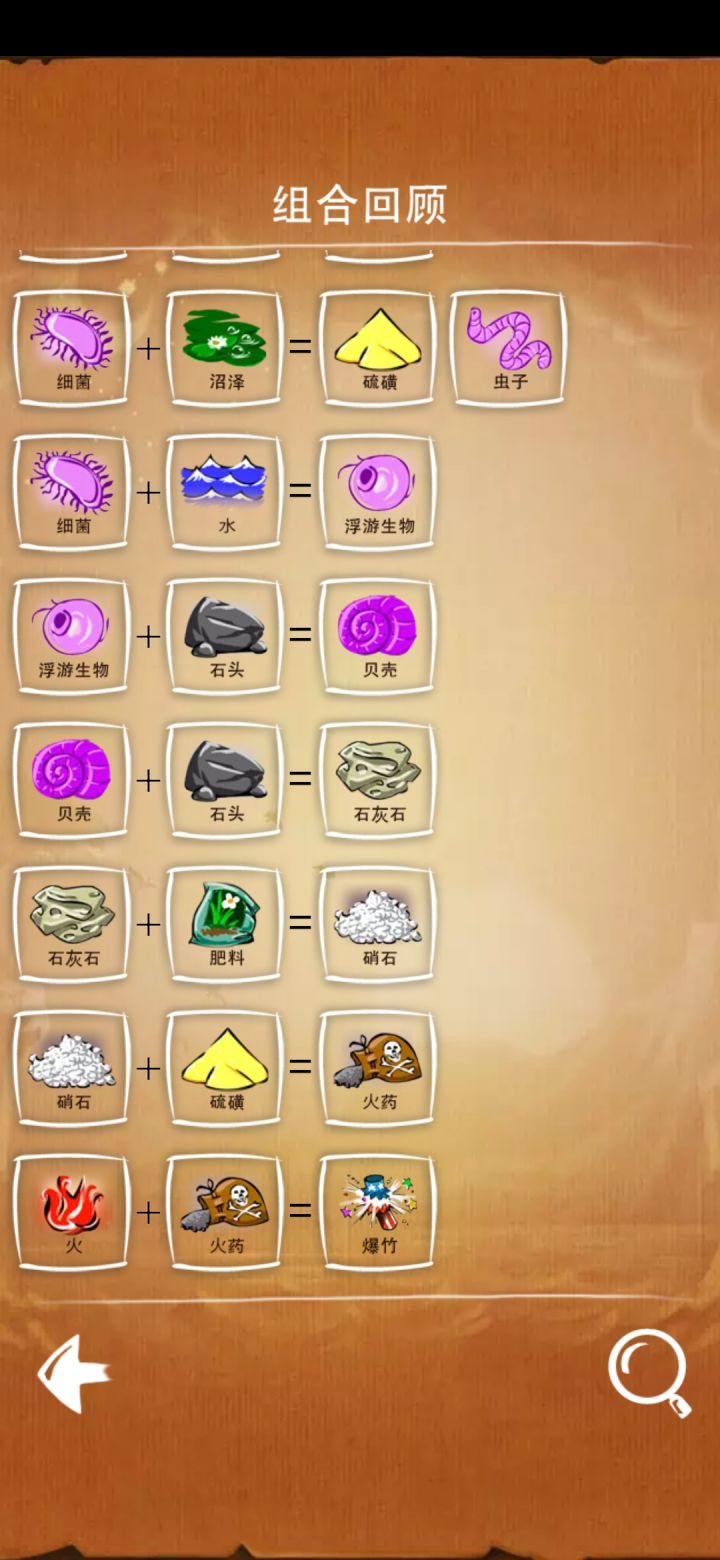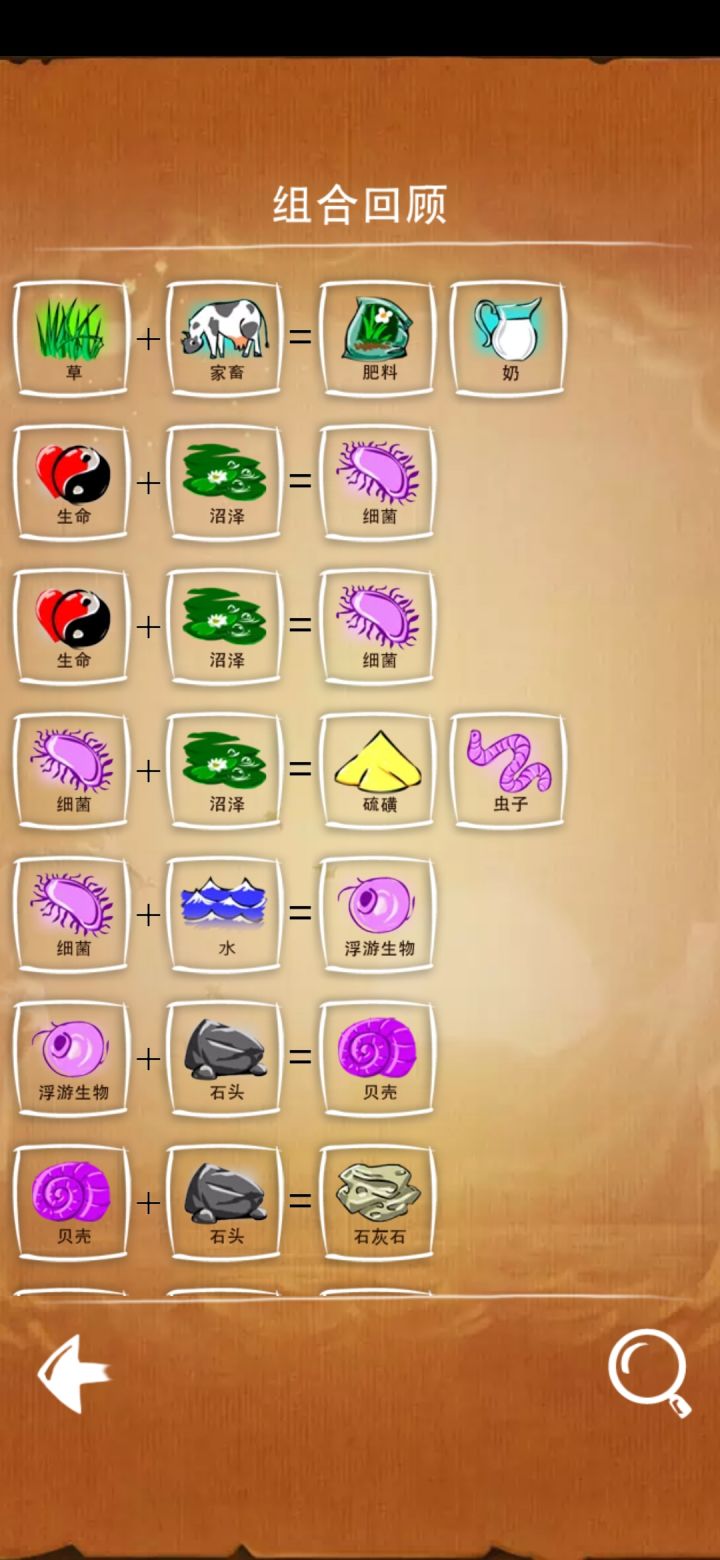 土系合成表(共8种)1 土2 石头 = 火山 + 风3 沙子 = 石头 + 水4 金属 = 石头 + 火5 玻璃 = 沙子 + 火6 粘土 = 沙子 + 沼泽7 石灰石 = 贝壳 + 石头8 化肥 = 家畜 + 草动物系合成表(共10种)1 蛋+风=鸟2 蛋+土=恐龙3 蛋+沙子=乌龟4 蛋+沼泽=蜥蜴5 蜥蜴+土=兽6 兽+水=鲸鱼7 人+兽=家畜8 细菌+浮游