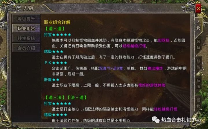 相信有相当一部分的玩家也是刚刚接触热血合击不久对这个游戏还只是一知半解为了帮助大家尽快度过新手期现在给大家带来一份新手期的攻略接下来请看详细内容职业组合推荐道道、法道和道法组合比较适合新手玩家,道士有施毒术,因此在前期不管是打宝还是PK都有很大的优势道战、道道和法法组合比较适合小资玩家,在装备和技能有一定基础时打怪和PK都能发挥出较大的战斗力,相比其他组合不足之处就是比较依赖装备战