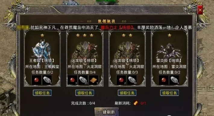 哈喽~大家好今天小编针对新伙伴推出一篇每日必做任务让新伙伴也可以更快地上手这个游戏呀!【经验】统领挑战土城NPC-日常统领挑战处进行挑战,每日有4次挑战机会,前往消灭指定统领怪物完成挑战;挑战任务按照任奖励、统领级别和击杀怪物数量的不同分为1星、2星和3星,其分别是火龙珠*1 荣誉之证*5(1星)、火龙珠*2 荣誉之证*10(2星)、火龙珠*3 荣誉之证*20 技能书页*5或金刚石
