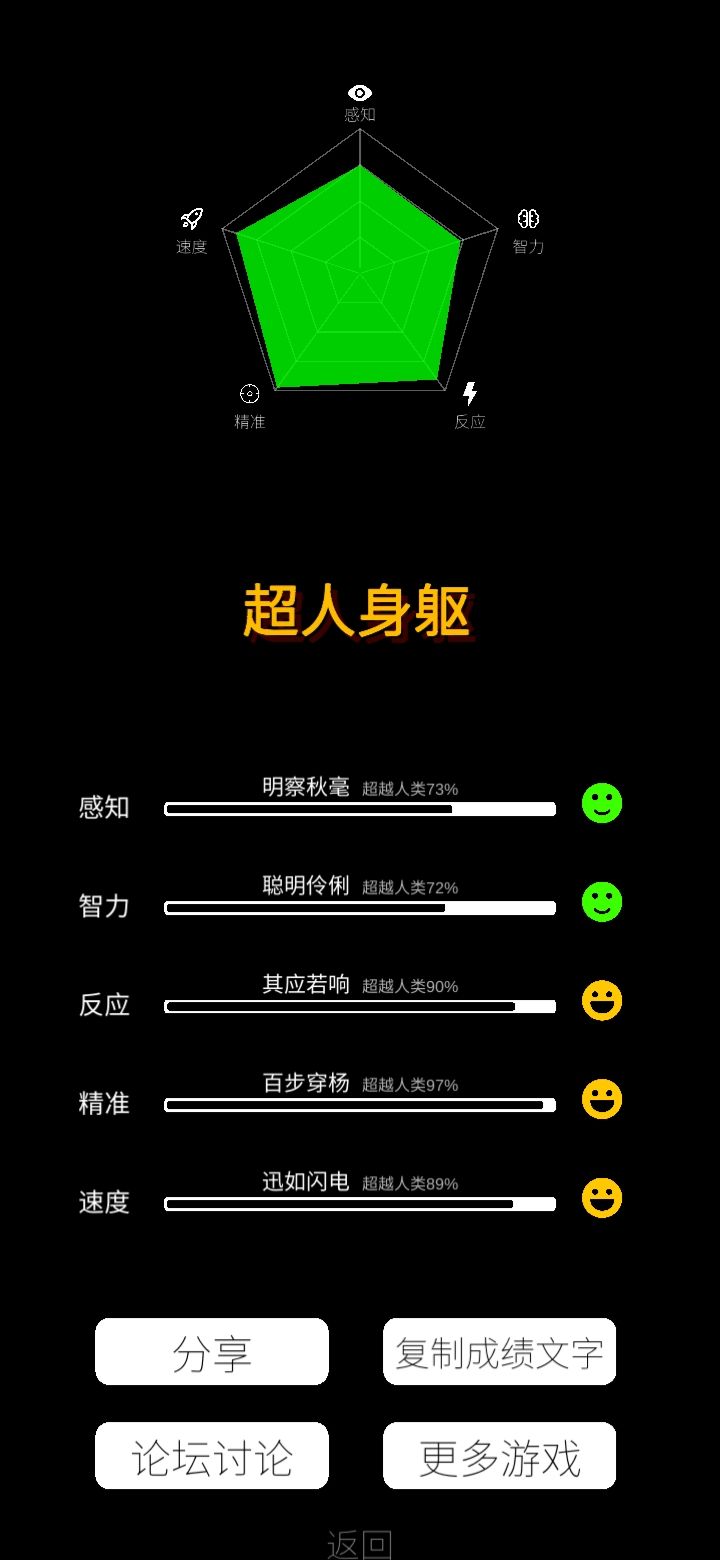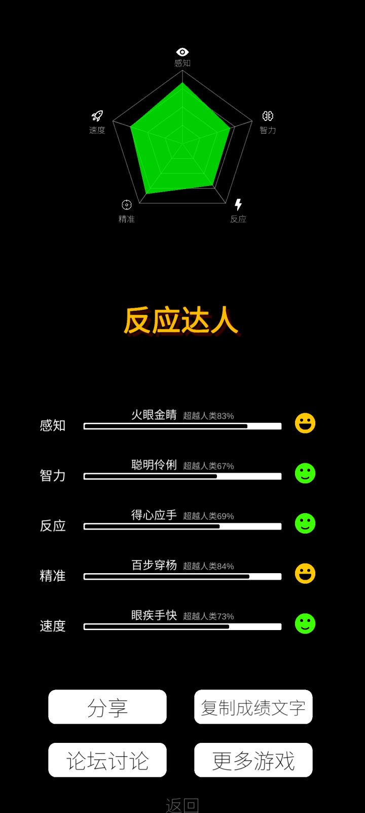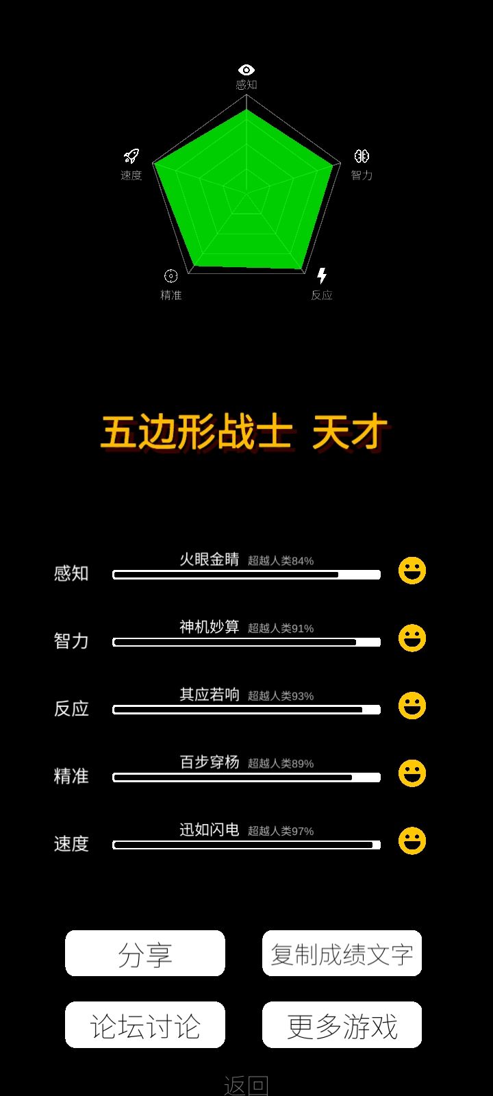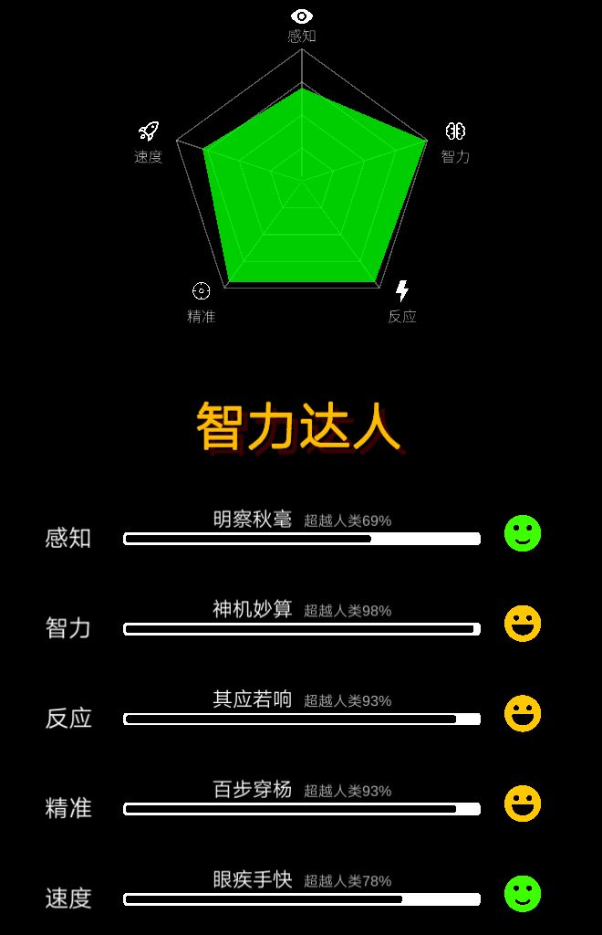 我在<我的属性>app中获得的称号 [五边形战士 天才]你也来玩吧 感知超越全球84% 智力超越全球91% 精准超越全球93% 反应超越全球89% 速度超越全球97% 你也来试试吧https://www.taptap.com/app/213413