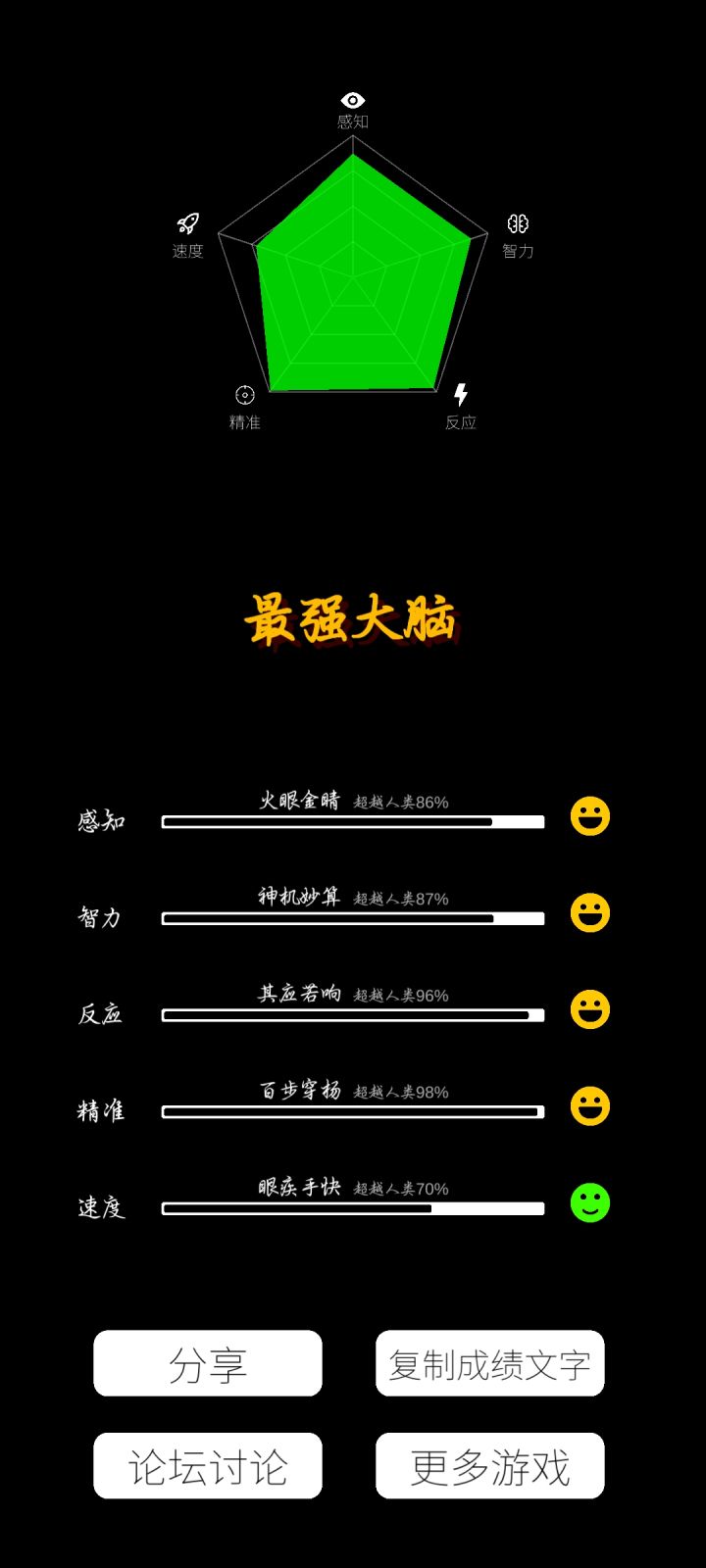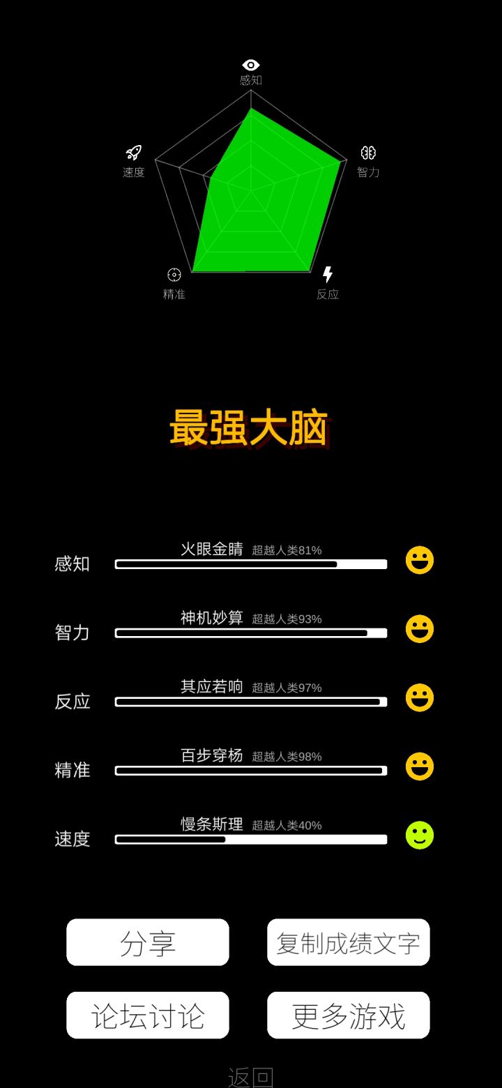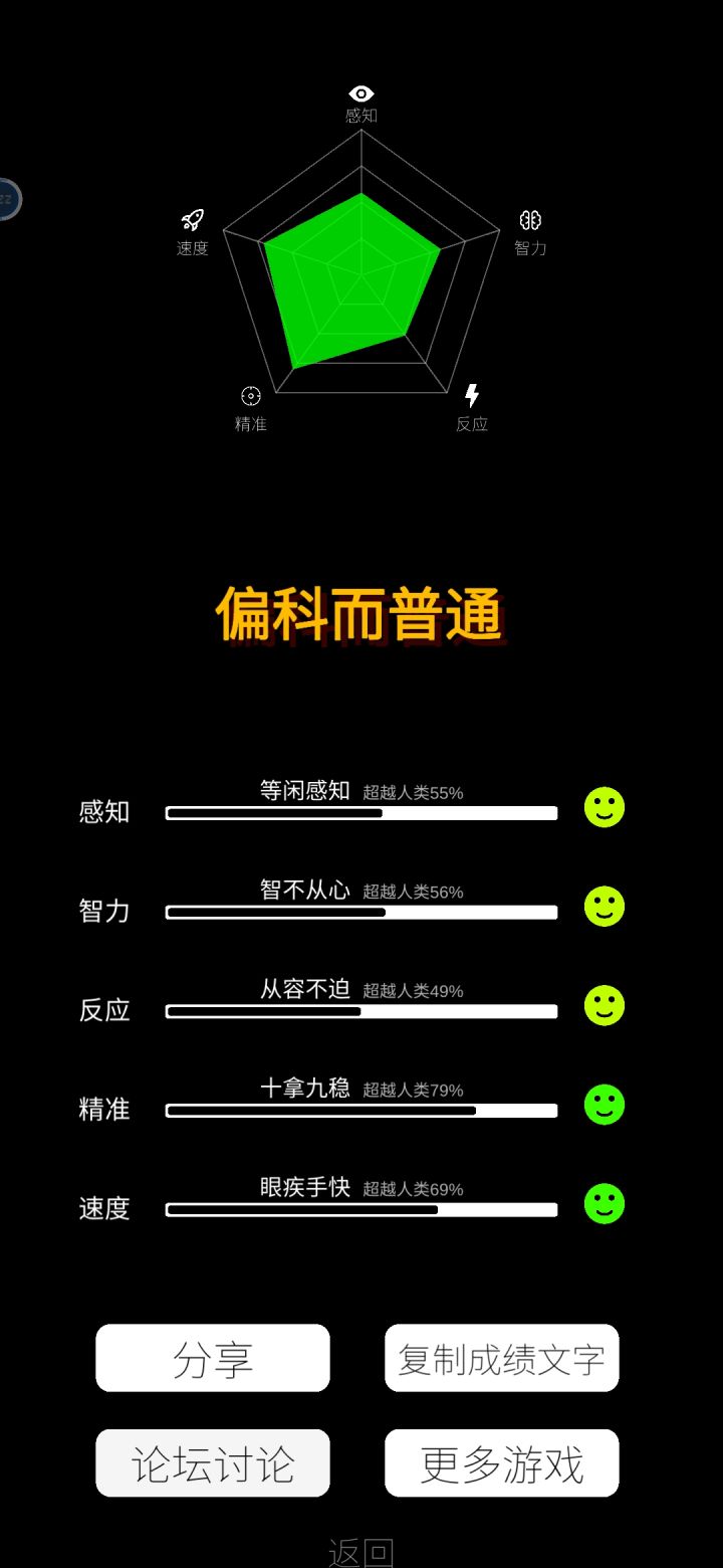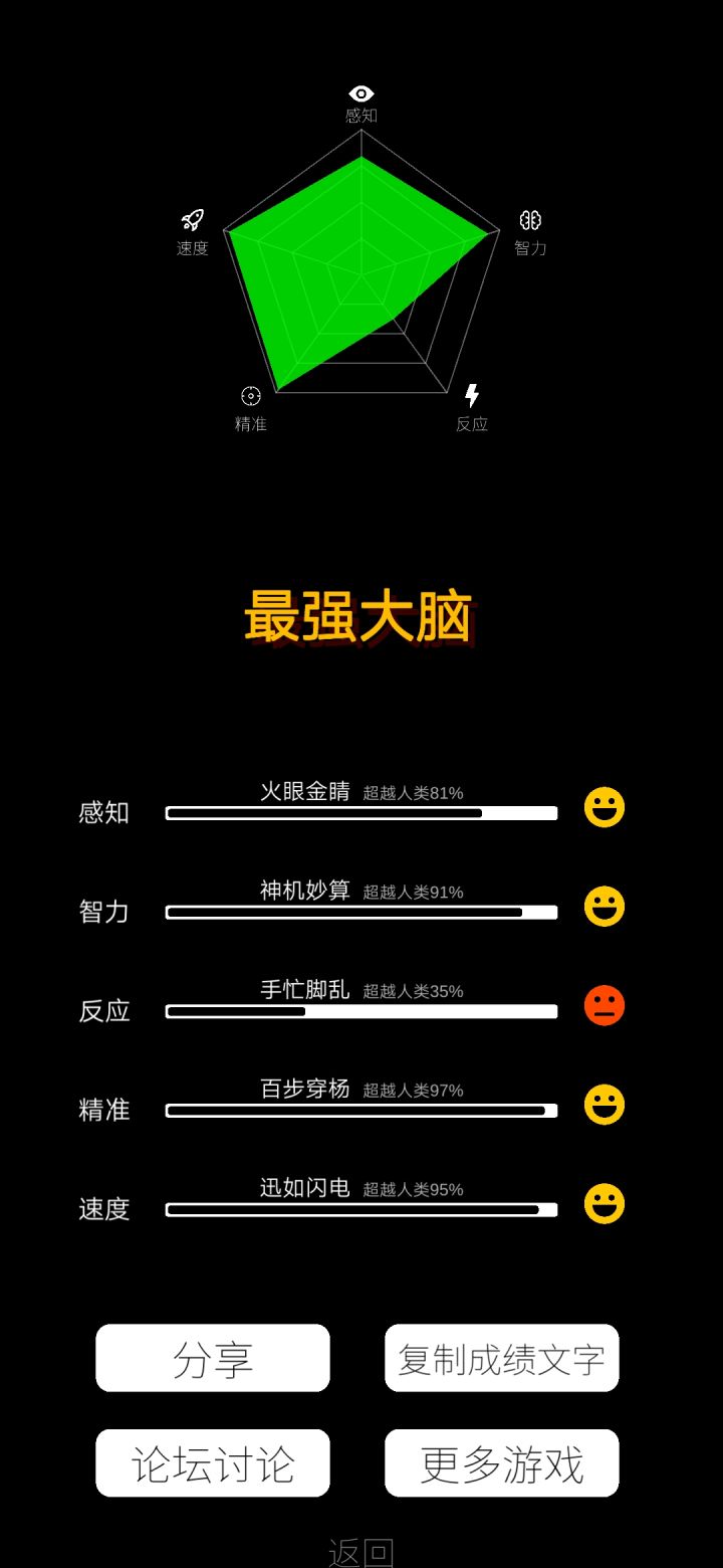 我在<我的属性>app中获得的称号 [五边形战士 天才]你也来玩吧 感知超越全球84% 智力超越全球91% 精准超越全球93% 反应超越全球89% 速度超越全球97% 你也来试试吧https://www.taptap.com/app/213413