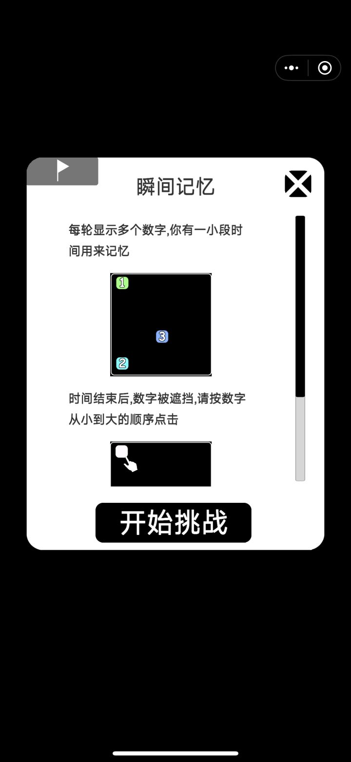 瞬时记忆指引说按照数字顺序点击,结果只出现色块压根没有数字,第一次得靠试错去分辨1234的顺序。